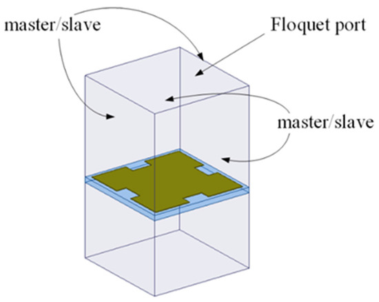 The simulation setting method of the metasurface structural unit is shown in the figure. The master–slave boundary condition is used around the Floquet excitation port, and the simulation results of the metasurface structural unit are shown in Figure 8.