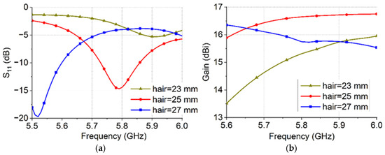(1) Figure 10 show the S11 and gain of the antenna when the thickness of the air dielectric layer is changed. When the height changes from 23 mm to 27 mm, the resonant frequency of the antenna decreases from 5.9 GHz to 5.52 GHz. In addition, the change in height affects the matching of the antenna. Figure 10b shows that at 5.8 GHz, the gain of the antenna increases from 15.5 dBi to 16.6 dBi and again decreases to 15.8 dBi as the height increases.