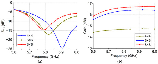 (2) The number of units of the metasurface array structure, S11, and the gain of the antenna are shown in Figure 11. Figure 11a,b shows that as the number of units increases, when the resonance frequency of the antenna changes from 4 × 4 to 8 × 8, the resonance frequency of the antenna varies from 5.78 GHz to 5.9 GHz; in addition, the gain of the array antenna varies from 14.5 dBi to 16.6 dBi. These results indicate that more metasurface array structural units correspond to larger structural size and greater gain of the antenna.