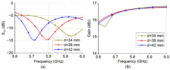 (3) The spacing between array antenna units, the S11, and the gain of array antennas are shown in Figure 12. The figures show that as the spacing of the antenna units varies from 34 mm to 42 mm, the resonance frequency of the antenna varies from 5.95 GHz to 5.7 GHz. According to the theoretical analysis of the array antenna, the gain of the 2 × 2 array antenna may be increased to a certain extent by increasing the distance between the antenna units. Considering the FP antenna designed in this study, the metasurface array structure needs to be comprehensively considered during design. The simulation results indicate that at the operating frequency of 5.8 GHz, when the antenna units have different spacing, the effect on the gain of the array antenna is small and it fluctuates slightly.