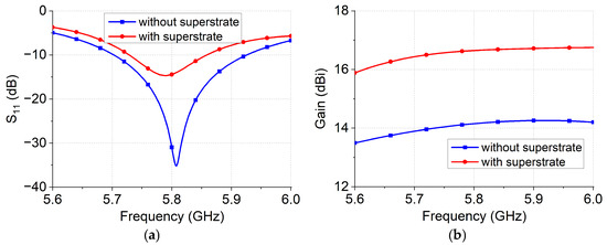 Simulation results of antennas with/without superstrate. (a) S11, (b) gain.