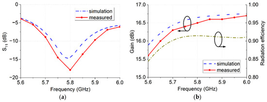 The simulation results of the array antenna are shown in Figure 15, which shows that its −10 dB working bandwidth is 5.71–5.89 GHz. Within the frequency band, the gain of the array antenna is higher than 16.2 dBi, whereas at the operating frequency of 5.8 GHz, the gain of the array antenna is 16.5 dBi. Radiation efficiency is more than 90% over the working bandwidth.