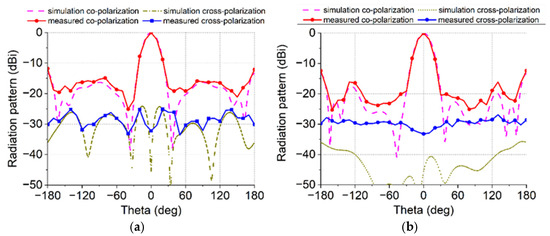 The normalization pattern of the E- and H-planes of the antenna is shown in Figure 16. Figure 16a,b, shows that in the E-plane of the antenna, the cross-polarization ratio exceeds 25 dB, whereas the cross-polarization ratio on the H-plane is lower than 28 dB; the antenna has lower cross-polarization characteristics.