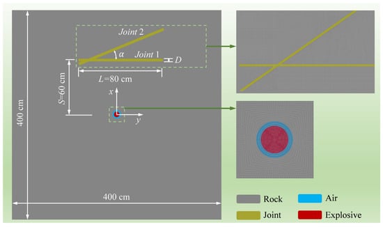 Schematic diagram of the numerical model for blasting in intersecting-joint rock.