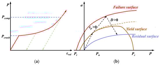Schematic diagram of RHT model []. (a) p-α equation of state; (b) Stress limit surfaces.