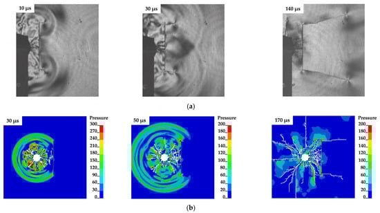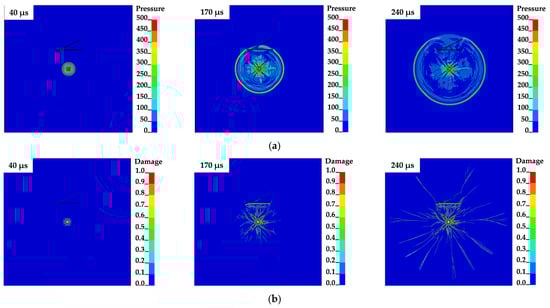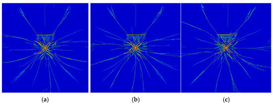 Based on literature [], the effectiveness and validity of the numerical simulation were verified through laboratory experiments. Figure 3 illustrates the propagation of explosive stress waves and the resulting crack development under different conditions.