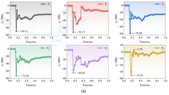 Figure 6 illustrates the temporal evolution of radial and circumferential stresses at the monitoring points, where tensile stress is defined as positive and compressive stress as negative. Overall, the radial stress remains predominantly compressive, whereas the circumferential stress alternates between compression and tension.