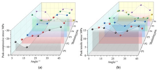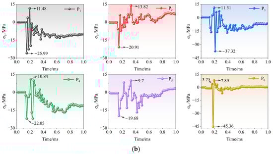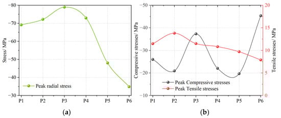 Peak stress curves at different monitoring points. (a) Radial; (b) Circumferential.