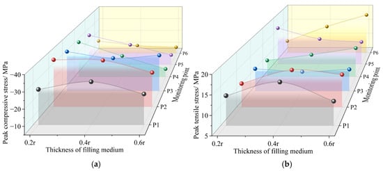 As discussed above, the interaction between the intersecting joints is strongest at a joint angle of 35°. To examine the effect of joint infill thickness on stress wave propagation, the case with a 35° joint angle was analyzed. Peak radial and circumferential stresses at each monitoring point were extracted, as shown in Figure 10.