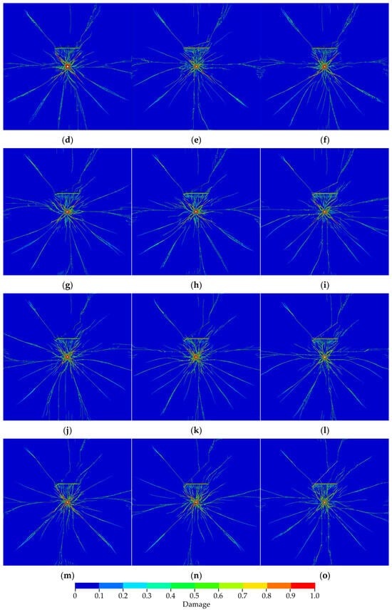 Crack Propagation Patterns in Intersecting-joint under Blasting with Different Joint Characteristics. (a) α = 5°, D = 0.2 r; (b) α = 5°, D = 0.4 r; (c) α = 5°, D = 0.6 r; (d) α = 15°, D = 0.2 r; (e) α = 15°, D = 0.4 r; (f) α = 15°, D = 0.6 r; (g) α = 25°, D = 0.2 r; (h) α = 25°, D = 0.4 r; (i) α = 25°, D = 0.6 r; (j) α = 35°, D = 0.2 r; (k) α = 35°, D = 0.4 r; (l) α = 35°, D = 0.6 r; (m) α = 45°, D = 0.2 r; (n) α = 45°, D = 0.4 r; (o) α = 45°, D = 0.6 r.
