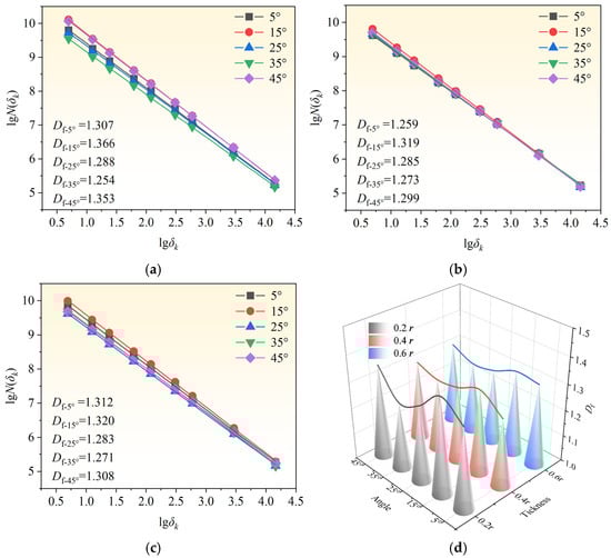 Calculation curves of box-counting dimension. (a) D = 0.2 r; (b) D = 0.4 r; (c) D = 0.6 r; (d) fractal dimension curve.