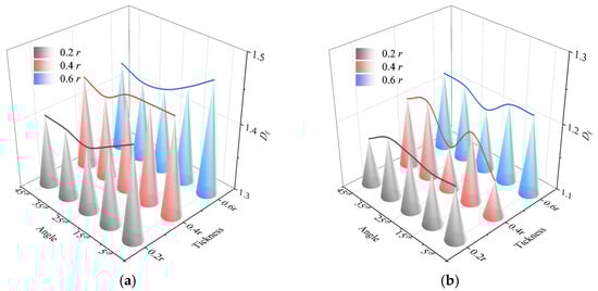 Based on the above analysis, the stress distribution near the joint tip is significantly affected by the joint characteristics. To further quantify the influence of joint angle and thickness on the peak stress, monitoring point P6 was selected as the reference, with α = 5° and D = 0.2 r as the baseline conditions. The variations in radial and circumferential peak stresses under different joint angles and thicknesses were evaluated in terms of percentage increase or decrease relative to the reference case, as summarized in Table 4.