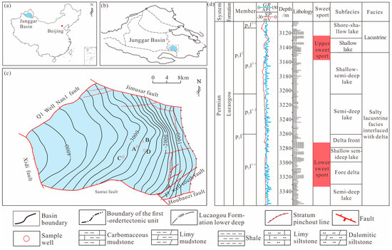 Location of the study area. (a) Geographic pattern of the Junggar Basin in NW China; (b) The tectonic unit of Junggar Basin and the location of Jimsar sag; (c) Structural isoline and well location distribution map of Permian Lucaogou Formation in Jimsar Sag; (d) Study on comprehensive stratigraphic histogram (Modified from. [29,30]). In the figure, A, B, C, and D refer to the four sampling wells.