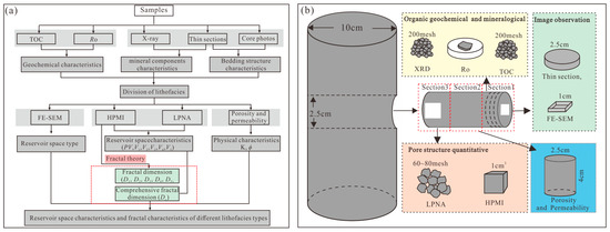 Workflow for analyzing pore structure and fractal characteristics of continental shale reservoirs. (a) Experimental design flowchart (b) Sample preparation procedure and specifications. Parameters in red boxes in (a) represent calculated values.