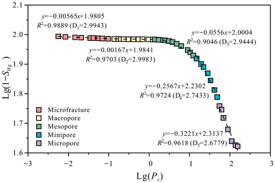 (3) The segmented linear segments evident in the double-logarithmic plot of lg(1 − SHg) versus lg(Pc) from the HPMI data were subjected to linear regression using the least squares method. The fractal dimension (Di) for each pore-size interval was subsequently calculated based on Equation (4) (Figure 3). A goodness-of-fit threshold (R2 > 0.85) was established; only intervals where the data points yielded an R2 value exceeding this threshold were considered to possess significant fractal characteristics, and their corresponding Di values were retained for further analysis. Intervals with R2 values below 0.85, indicating a lack of robust fractal behavior, were excluded from the subsequent calculation.