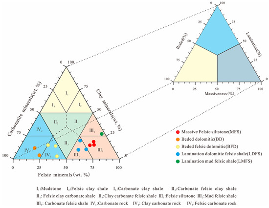 Shale lithofacies are defined by the integrated characteristics of organic matter abundance, sedimentary structures, grain size, and mineral composition, which collectively reflect specific depositional environments [57]. XRD analysis reveals that the Lucaogou Formation in the Jimsar Sag is predominantly composed of quartz, plagioclase, and dolomite. Quantitative analysis indicates average contents of 22.8% quartz, 23.4% feldspar (primarily plagioclase), and 30.5% dolomite. In contrast, clay mineral content is comparatively low, averaging 11.4% (Table 1). By integrating data from drill core observations, thin-section analysis, scanning electron microscopy (SEM) images, mineral grain size, laminar characteristics, and mineral ternary diagrams (Figure 4), the lithofacies of the Lucaogou Formation were systematically identified and classified. The predominant lithofacies types include massive felsic siltstone (MFS), bedded dolomite (BD), bedded felsic dolomite (BFD), laminated dolomitic felsic shale (LDFS), and laminated mud felsic shale (LMFS).