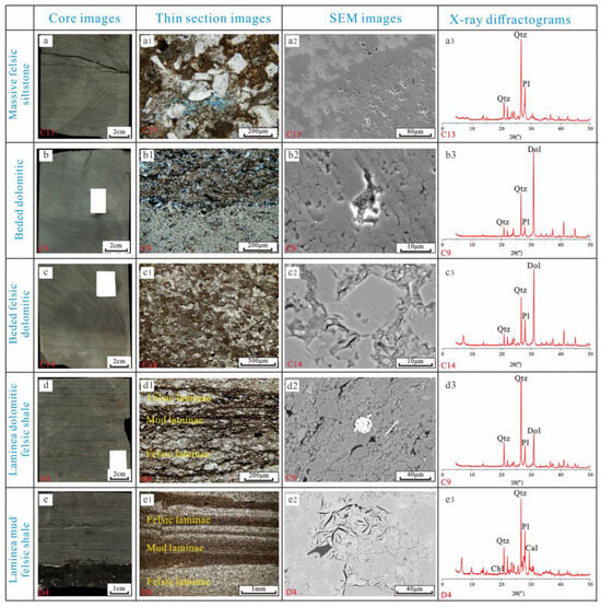 MFS displays a dark gray color and exhibits a thick, massive structure characterized by uniform texture and absence of distinct bedding. It contains over 70% quartz and feldspar minerals, with coarse-grained terrigenous clastic particles indicating a proximal transport-deposition system (Figure 5a–a3). BD shows light gray hues and a homogeneous micritic/microcrystalline dolomite composition, containing more than 70% dolomite with fine-grained textures (Figure 5b–b3). BFD is dark gray with millimeter-scale layering (1–10 mm thickness), primarily consisting of sparry dolomite (56.4% average carbonate content) and subordinate felsic minerals (29.1%) (Figure 5c–c3). LDFS exhibits alternating light and dark laminae under 1 mm thick, containing approximately 26.8% feldspar, 29.8% quartz, and 30.0% carbonate. Coarse felsic mineral layers are intercalated with fine-grained mixed matrix components (Figure 5d–d3). LMFS displays well-developed lamellar structures dominated by felsic minerals, with high clay content (>25%) and 4.3% pyrite, featuring uniformly fine mineral particles (Figure 5e–e3).