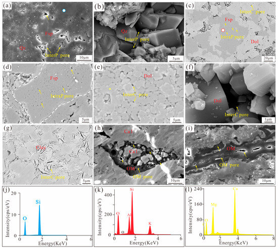 This figure illustrates the diverse microscopic pore systems developed in the Lucaogou Formation shale within the Jimsar Sag. (a) Well C, 3541.71 m, MFS, intergranular pore; (b) Well D, 3179.11 m, LDFS, intergranular pore; (c) Well B, 3389.84 m, MFS, intragranular pore; (d) Well A, 3300.72 m, LMFS, intragranular pore; (e) Well A, 3325.67 m, BD, dolomite intercrystalline pores; (f) Well A, 3318.69 m, BFD, dolomite intercrystalline pores; (g) Well D, 3295.36 m, LMFS, clay mineral intercrystalline pores; (h) Well C, 3461.35 m, LDFS, OM pore; (i) Well C, 3541.71 m, MFS, OM pore; (j) The energy spectrum corresponding to the blue point in (a); (k) The energy spectrum image corresponding to the red point in (c); (l) The energy spectrum corresponding to the yellow point in (e).