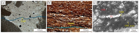 The shale oil reservoirs of the Lucaogou Formation in the Jimsar Sag exhibit multiscale pore systems ranging from nanometers to micrometers. According to Loucks’ classification scheme [57], the reservoir spaces are categorised into three types: inorganic mineral pores, organic matter pores, and microfractures. The pores of inorganic minerals include intergranular pores, intragranular pores, and intercrystalline pores. Organic pores include kerogen-related pores and solid asphalt-related pores. Microfractures include three types: tectonic microfractures (TMFs), shrinkage microfractures (SMFs), and bedding-parallel microfractures (BPMFs).