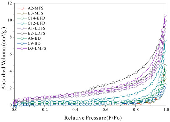 LPNA measurements were performed using a TriStar II 3020 surface area and porosity analyzer (Micromeritics Instrument Corporation, Norcross, GA, USA) in accordance with the Chinese standard GB/T 21650.2-2008 [43]. Prior to analysis, the samples were crushed and sieved to obtain particles ranging from 60 to 80 mesh (0.18–0.25 mm). Subsequently, 0.5–1.0 g of each sample was subjected to vacuum degassing at 150 °C for 3 h. The degassed samples were then analyzed by measuring N2 adsorption–desorption isotherms at liquid nitrogen temperature across a relative pressure (P/P0) range of 0.010 to 0.998. The specific surface area (SSA) was calculated from the adsorption data using the Brunauer–Emmett–Teller (BET) method, while the pore volume (PV) and pore size distribution (PSD) were derived from the adsorption branch using the Barrett–Joyner–Halenda (BJH) model [44].