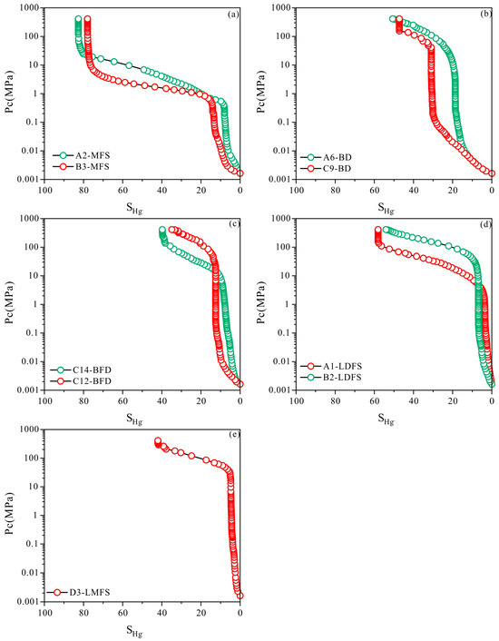Based on the distribution characteristics of mercury saturation, the capillary pressure curves can be classified into three distinct types. For the MFS lithofacies, the mercury intrusion curve exhibits a gradual increase in mercury volume during the initial low-pressure stage (<0.6 MPa). A pronounced platform appears abruptly at approximately 0.6 MPa, beyond which the mercury volume stabilizes as the pressure increases to 25 MPa, indicating a predominantly concentrated pore-size distribution within this lithofacies (Figure 9a). In contrast, the mercury saturation curves for BFD and BD increase slowly during the initial low-pressure stage. When the pressure reaches approximately 0.1 MPa, the mercury saturation remains largely constant. As the pressure further increases to 100 MPa, the mercury saturation begins to rise slowly in response to the elevated pressure. This pattern reflects the presence of two distinct pore-size distribution intervals with significant differences in pore throat radii within the carbonate-rich lithofacies (Figure 9b–c). For the LDFS and LMFS, the mercury saturation remains essentially unchanged during the initial stage of mercury intrusion. When the inlet pressure exceeds 25 MPa, the mercury saturation increases rapidly. This curve type suggests that the pore-size distribution in LDFS and LMFS is relatively concentrated (Figure 9d,e).