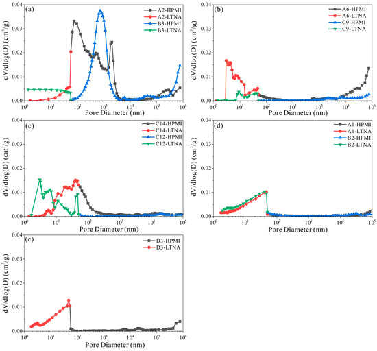 Full-scale pore size distribution curves of the Lucaogou Formation in Jimsar Sag: (a) MFS; (b) BD; (c) BFD; (d) LDFS; (e) LMFS.