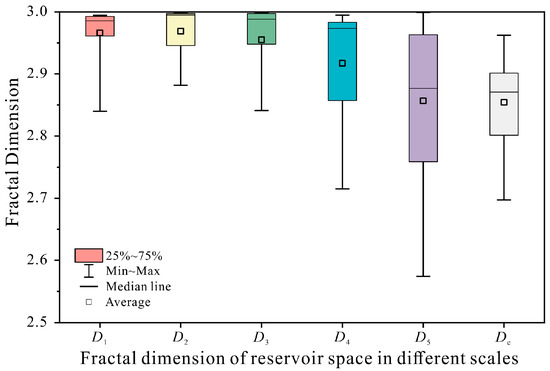 Box plot showing the distribution of fractal dimensions in reservoir space across different scales. D1, D2, D3, D4, and D5 represent the fractal dimensions of micro-fractures, macro-pores, meso-pores, micro-pores, and micropores, respectively; Dc indicates the comprehensive fractal dimension.
