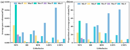 Pore volume distribution characteristics of different lithofacies in the Lucaogou Formation, Jimsar Sag. (a) Absolute pore volume distribution across distinct pore-size ranges. (b) Relative percentage distribution of each pore-size range normalized to the total pore volume. Abbreviations: Mic P, micropores (<25 nm); Min P, minipores (25–100 nm); Mes P, mesopores (100–1000 nm); Mac P, macropores (1–10 μm); Microfractures (>10 μm).