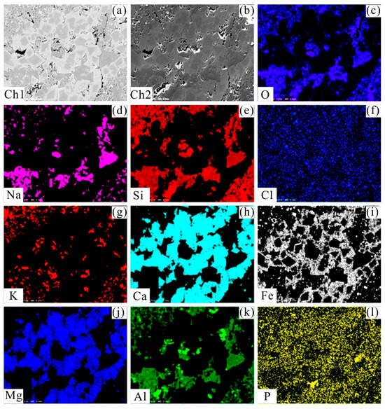 Different element surface distribution observed under scanning electron microscope in Lucaogou Formation of Jimsar Sag, A6, BD. (a) Backscattered electron (BSE) image; (b) Secondary electron (SE) image; (c–l) Elemental distribution maps for oxygen (O), Sodium (Na), Silicon (Si), chlorine (Cl), Kalium (K), Calcium (Ca), Ferrum (Fe), Magnesium (Mg), Aluminum (Al), and Phosphorus (P).