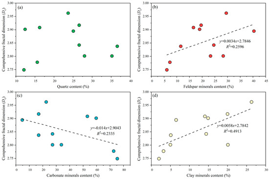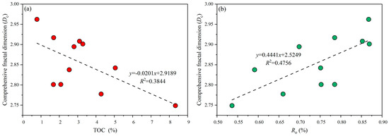 Correlations between organic geochemical parameters and the comprehensive fractal dimension (Dc) in the shale reservoirs of the Lucaogou Formation, Jimsar Sag. (a) TOC; (b) Ro.