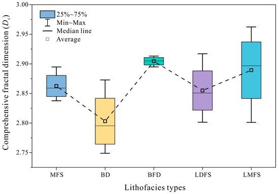 Box plot illustrating the distribution of comprehensive fractal dimension (Dc) values across different lithofacies in the Lucaogou Formation, Jimsar Sag.