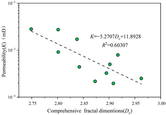 Correlation between measured permeability (K) and the comprehensive fractal dimension (Dc) of shale reservoirs in the Lucaogou Formation, Jimsar Sag.