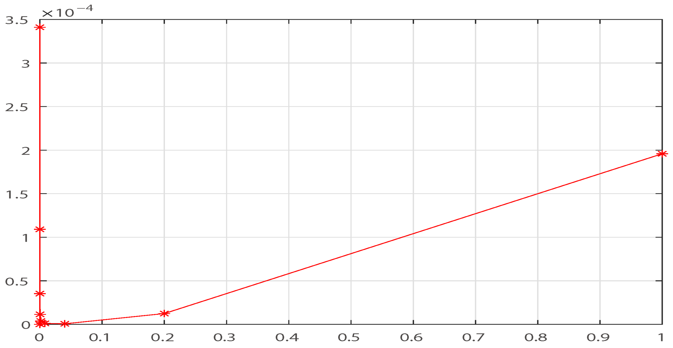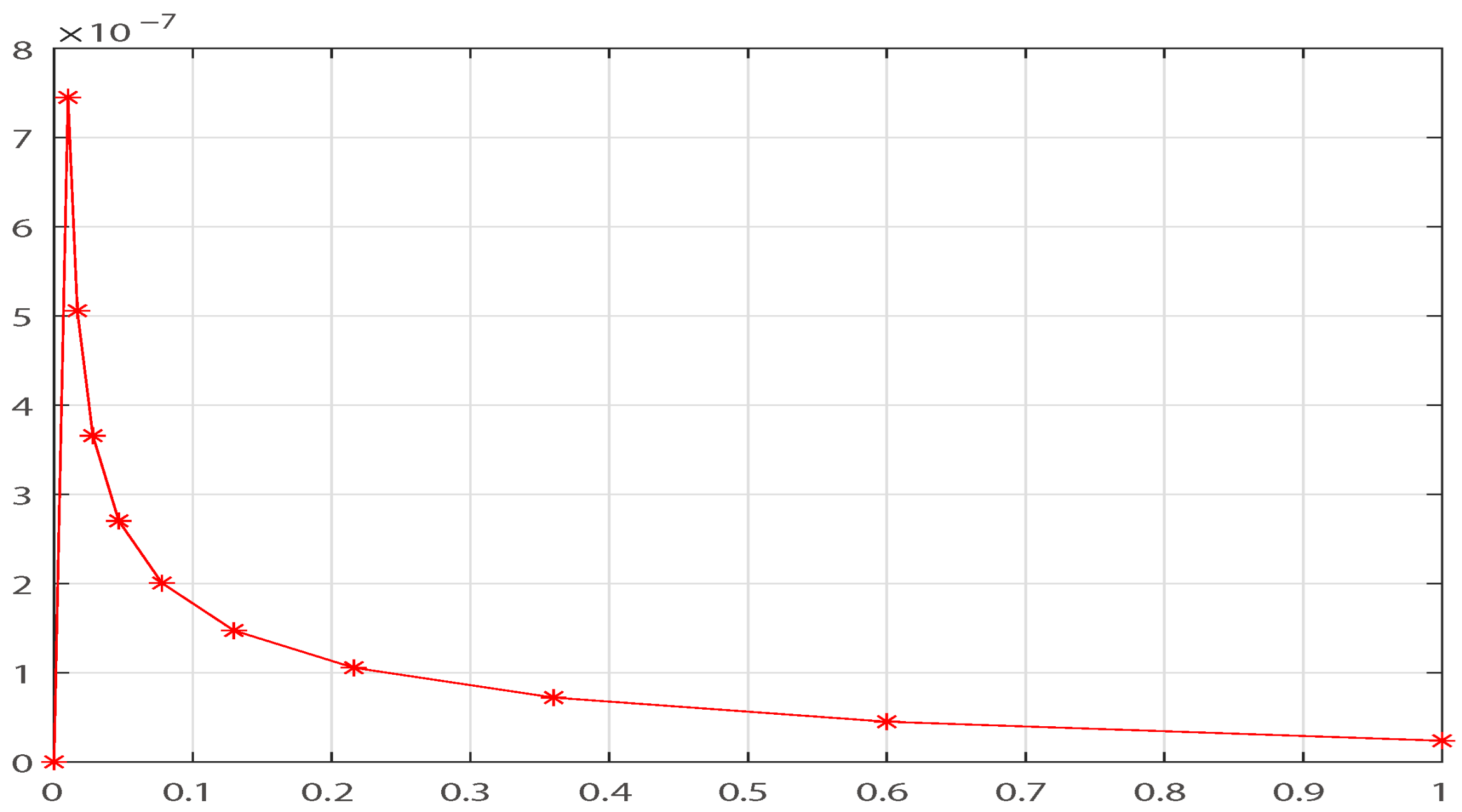 - Precomputation Phase: Before initiating the predictor–corrector iterations, all coefficients and are precomputed and stored. This is done using numerical quadrature methods (composite trapezoidal rule) applied to the q-grid subintervals. While this initial computation has complexity, it is performed only once, and the results are reused throughout the iterations, ensuring overall complexity for the solution process.