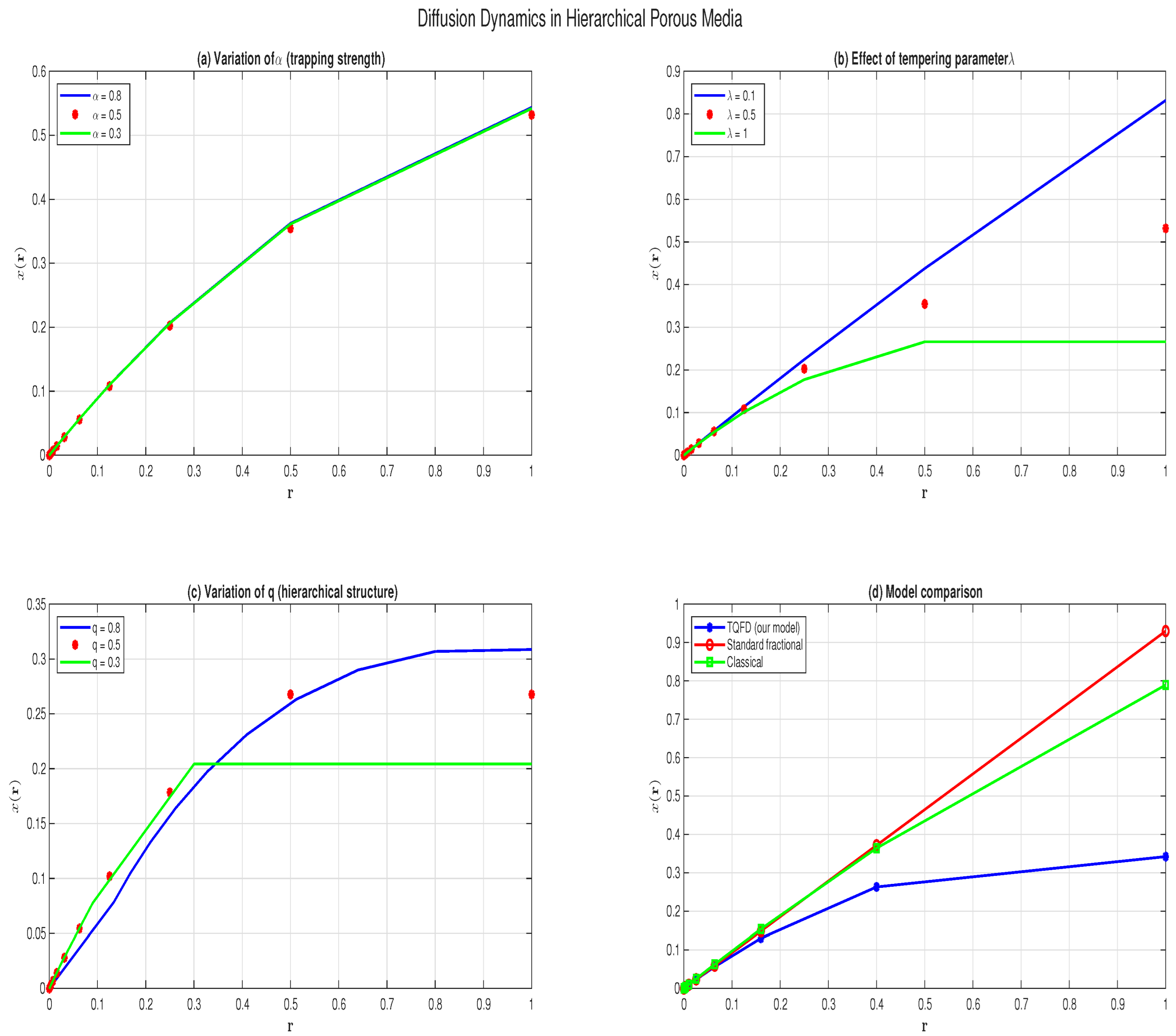 - Our Proposed Model (Tempered Quantum Fractional Diffusion): We propose the following equation to describe the concentration at a specific point in the medium:where encapsulates diffusion and source terms, is a generalized diffusivity constant, and the operator simultaneously captures the discrete geometry, memory effects, and finite correlation lengths characteristic of hierarchical porous media.