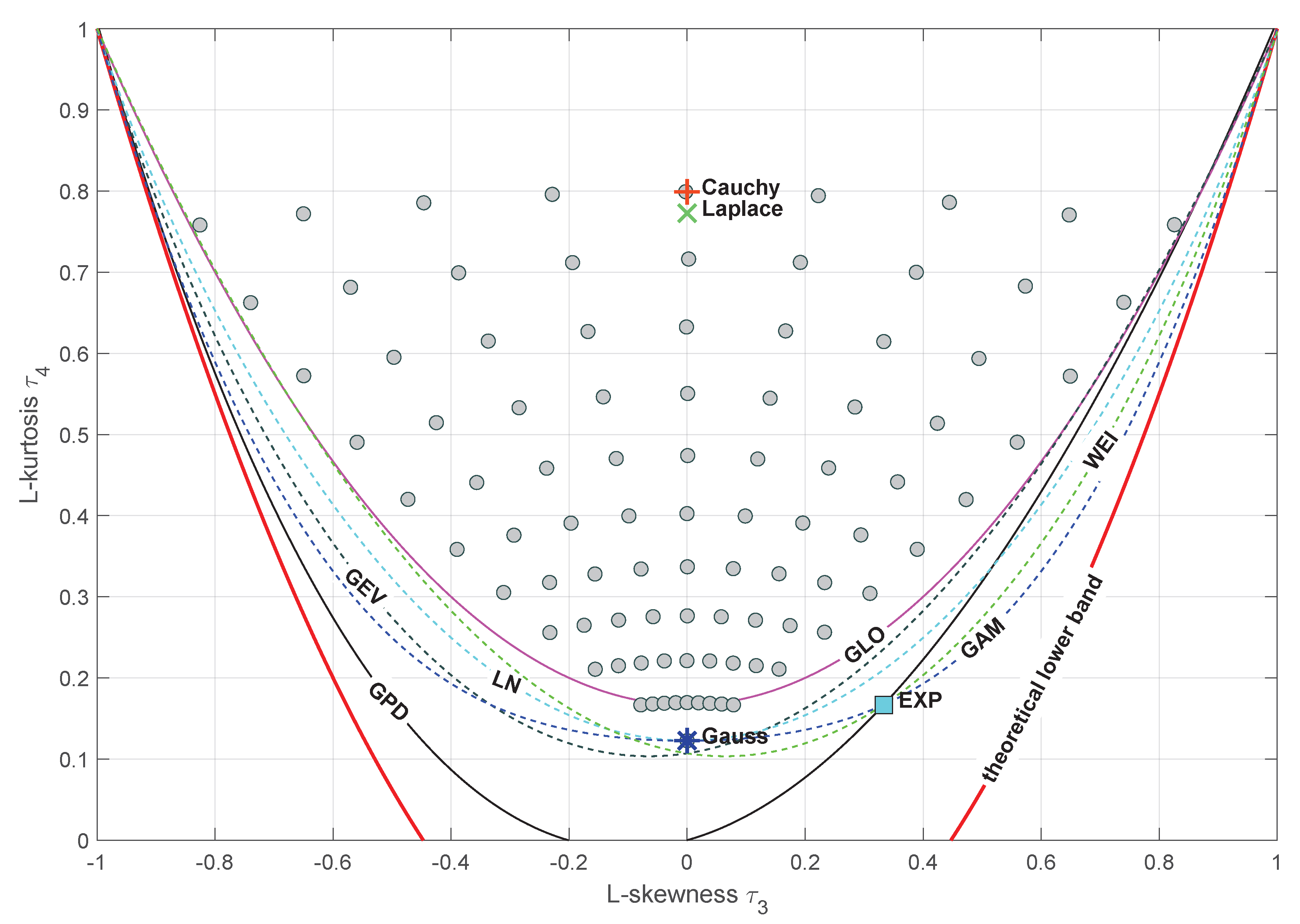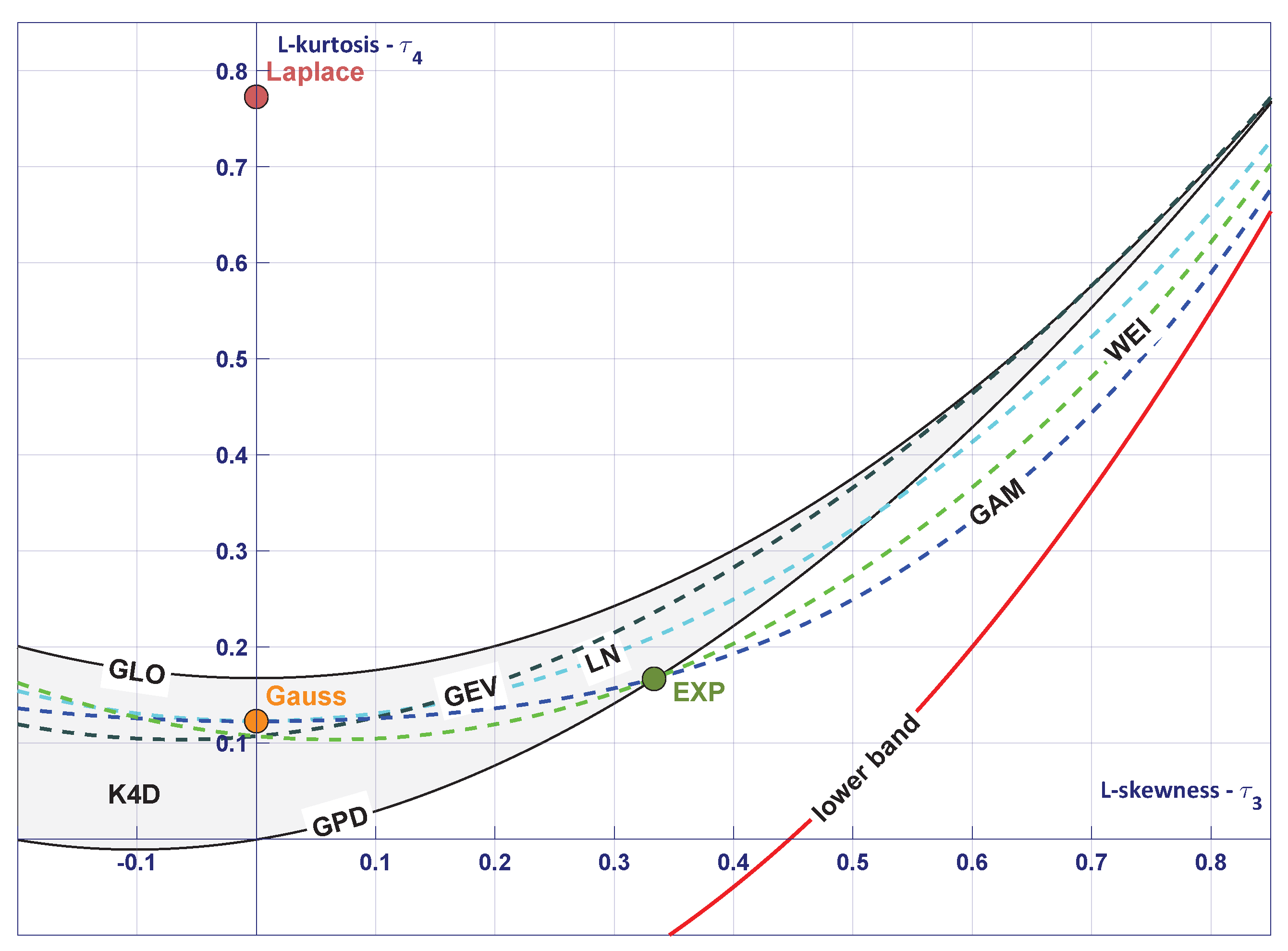 43]. Thus, one could take short time series, evaluate L-moments, draw L-moment diagram, and find appropriate distribution [