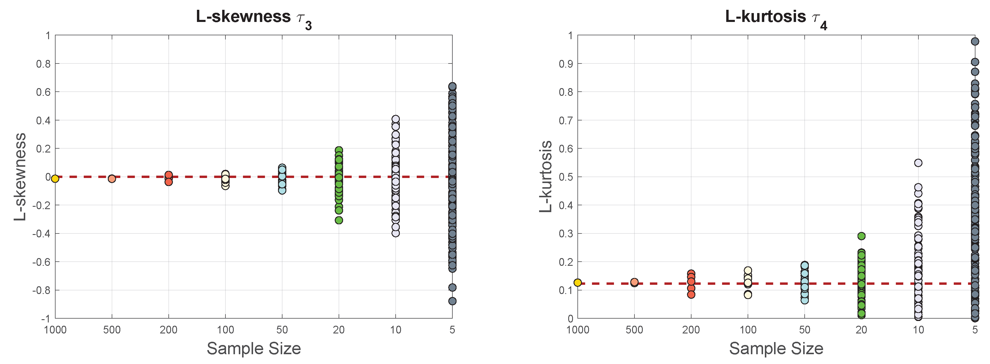 Figure 6 shows LMRD diagrams plotted for normal distribution. Each circle in these plots reflects one population of size