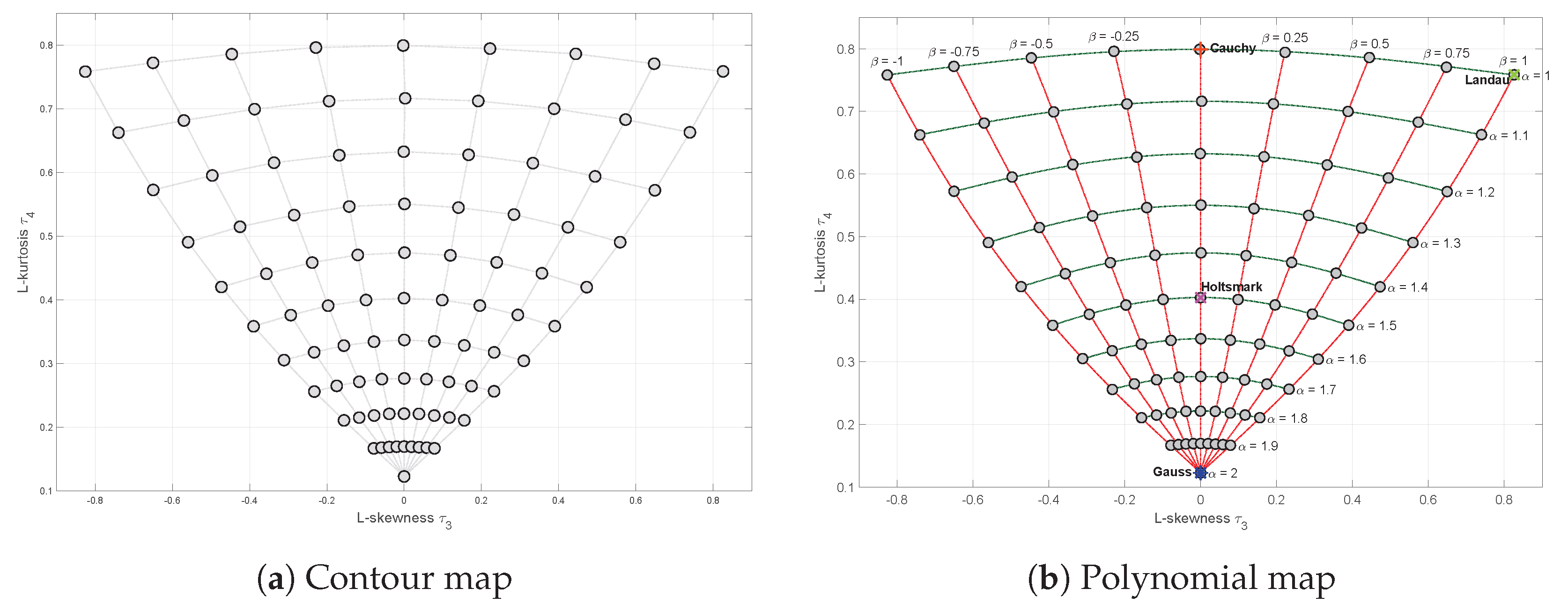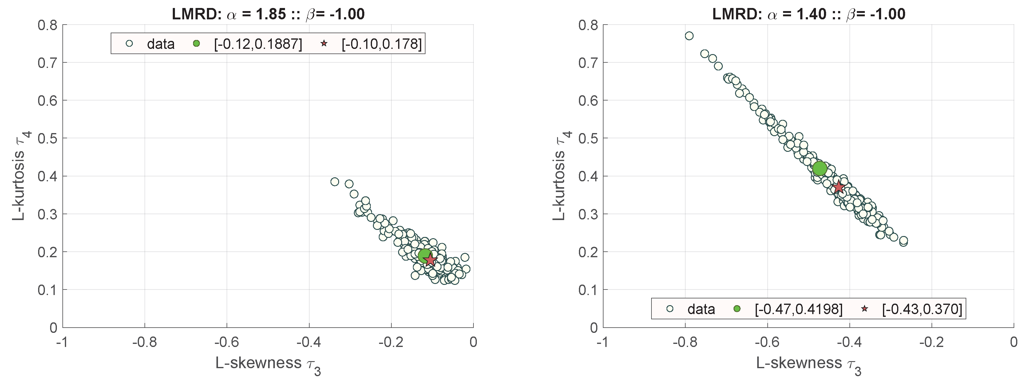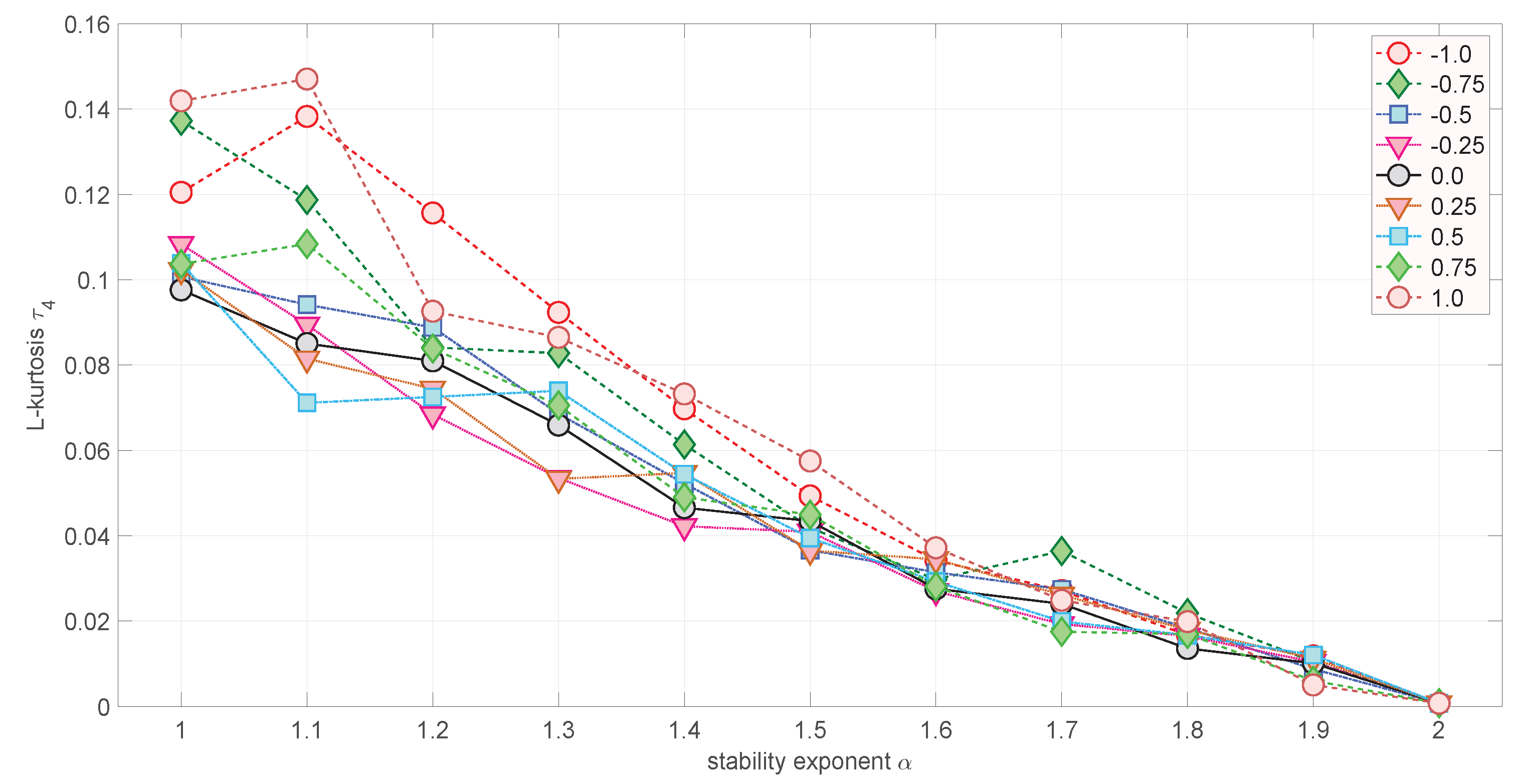 This approach is questionable in case of the -stable distribution. In case of , the first moment is infinite, but it does not dismiss this distribution from further research. Generally, one can evaluate L-moments for -stable distribution, as the first moment exists. However, the analysis might be seriously biased and difficult to interpret. This work tries to address this issue using LMRD representation.