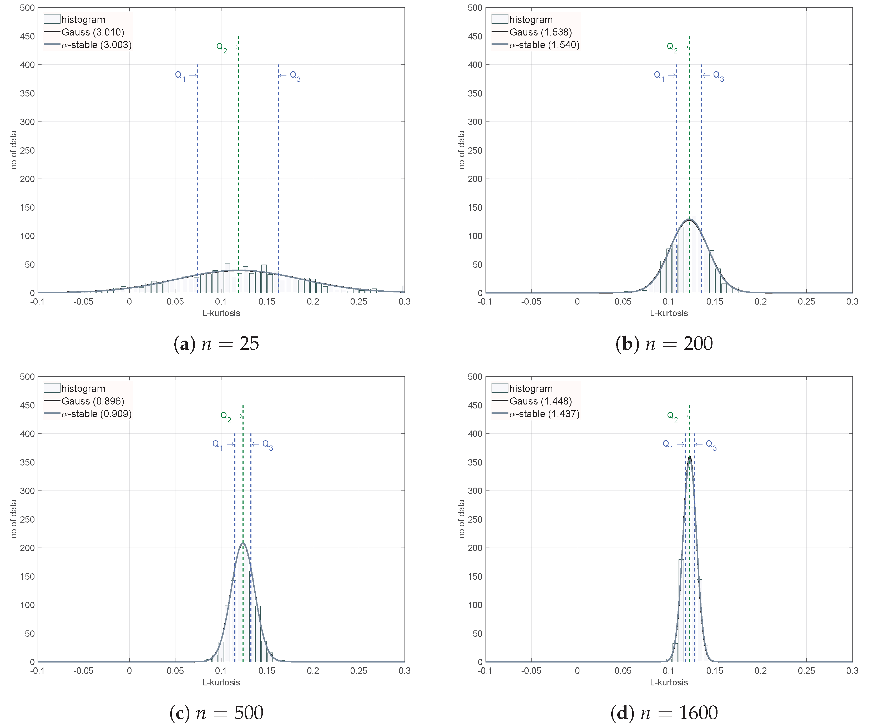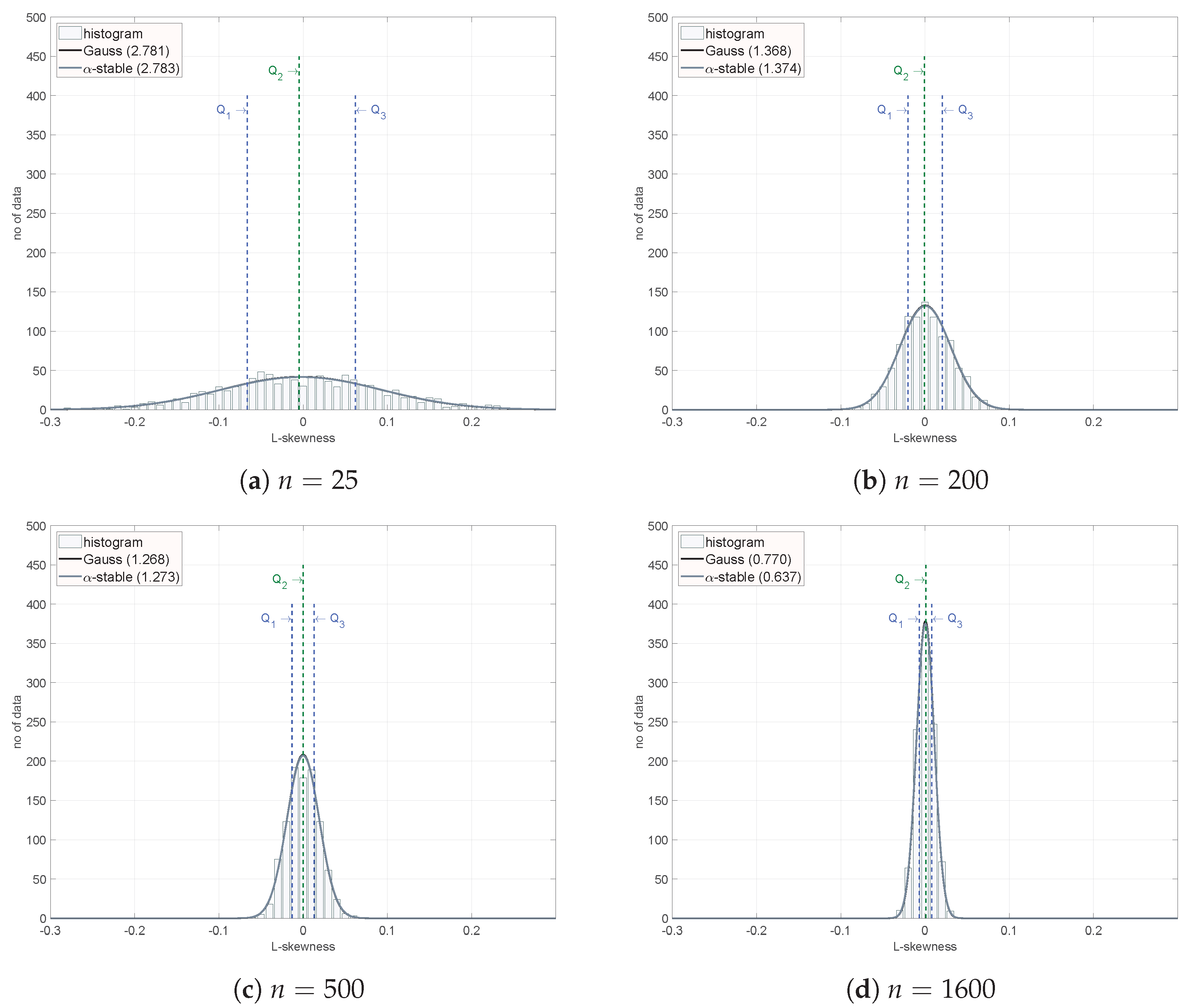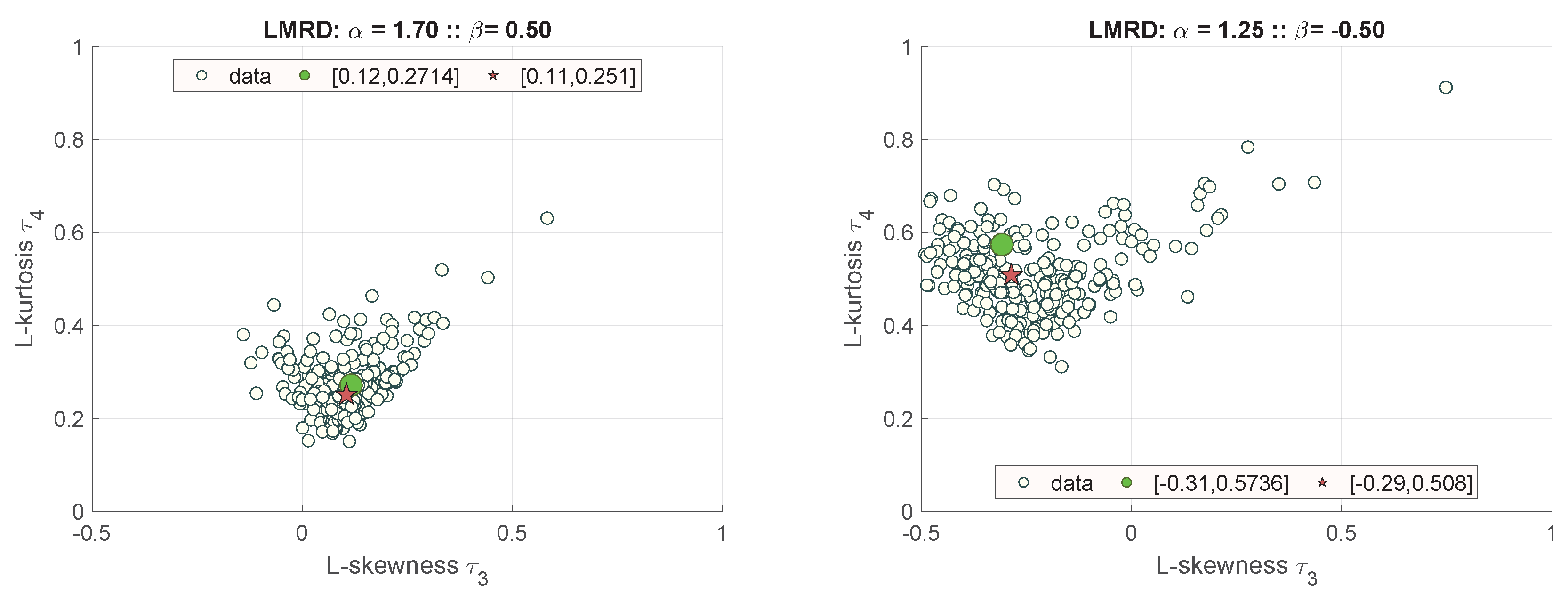 This approach is questionable in case of the -stable distribution. In case of , the first moment is infinite, but it does not dismiss this distribution from further research. Generally, one can evaluate L-moments for -stable distribution, as the first moment exists. However, the analysis might be seriously biased and difficult to interpret. This work tries to address this issue using LMRD representation.