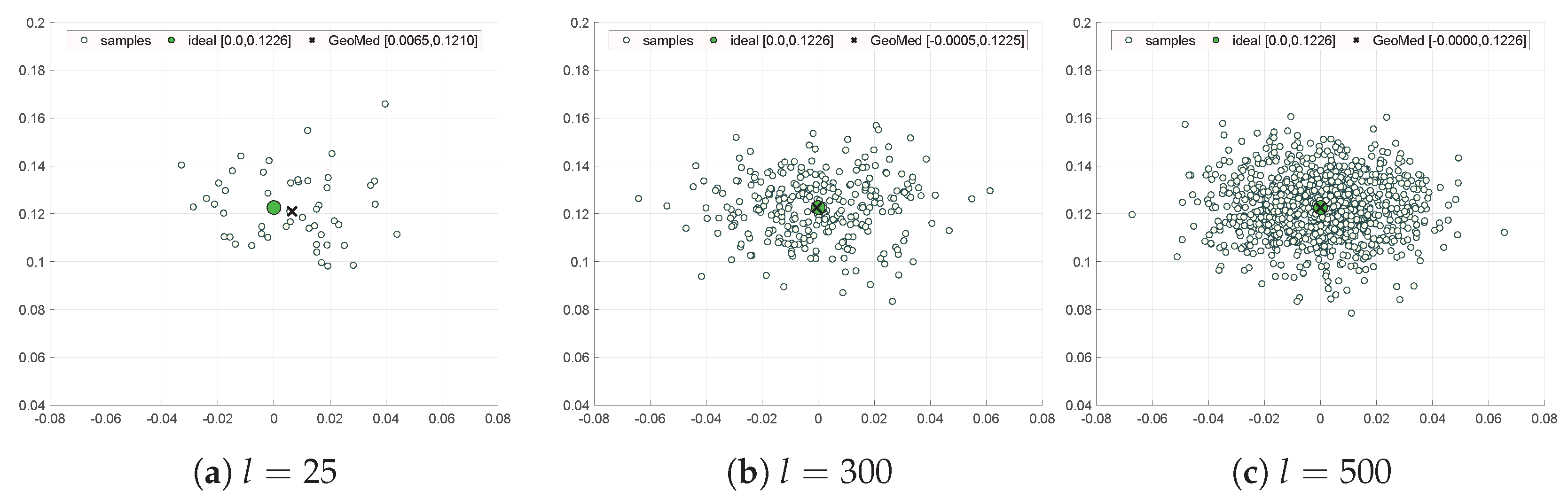 Nonetheless, the same experiment is repeated for -stable distribution. At first, we generate large number l = 10,000 of populations of size . We use the -stable random numbers generator and generate data for . The stability factor changes with a decrement and with a decrement . For each point, we find a GeoMed center.
