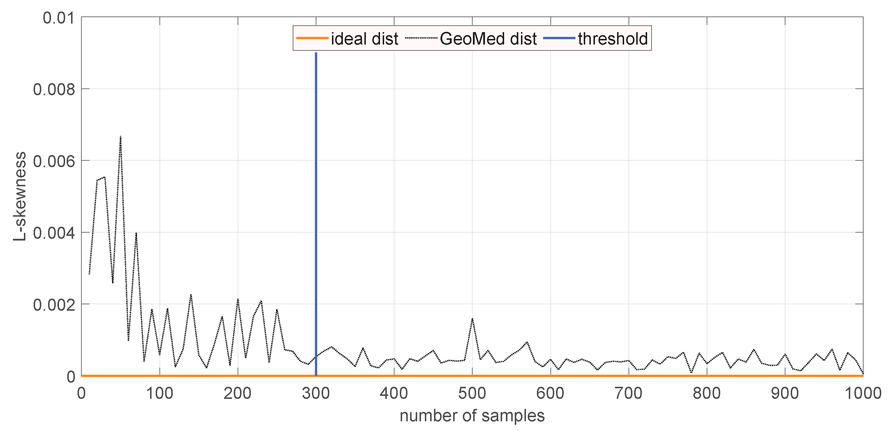 48]. Obtained results are somehow disappointing, as for proper and converging estimation we require extremely large number of observations, both in sample size and the population number. We also notice that the heavier the tail is, the more points are required to evaluate the proper GeoMed Monte-Carlo estimator of L-moments. This is hardly achievable in real life datasets.