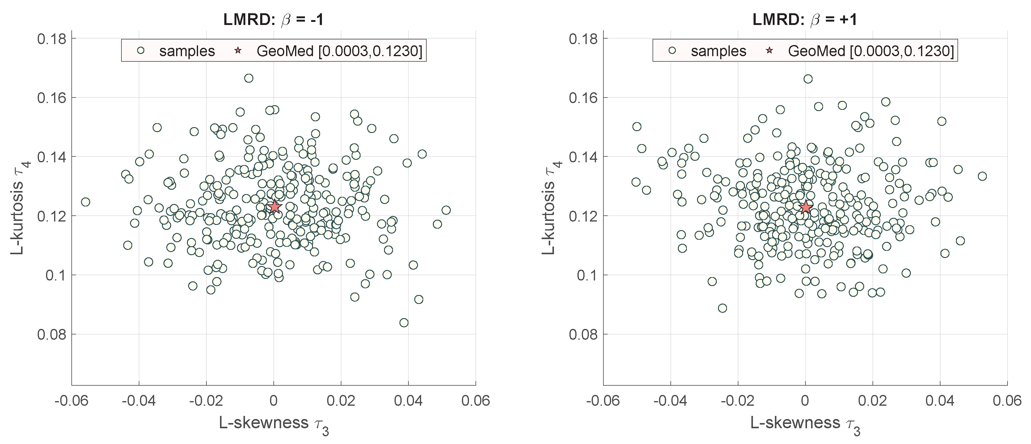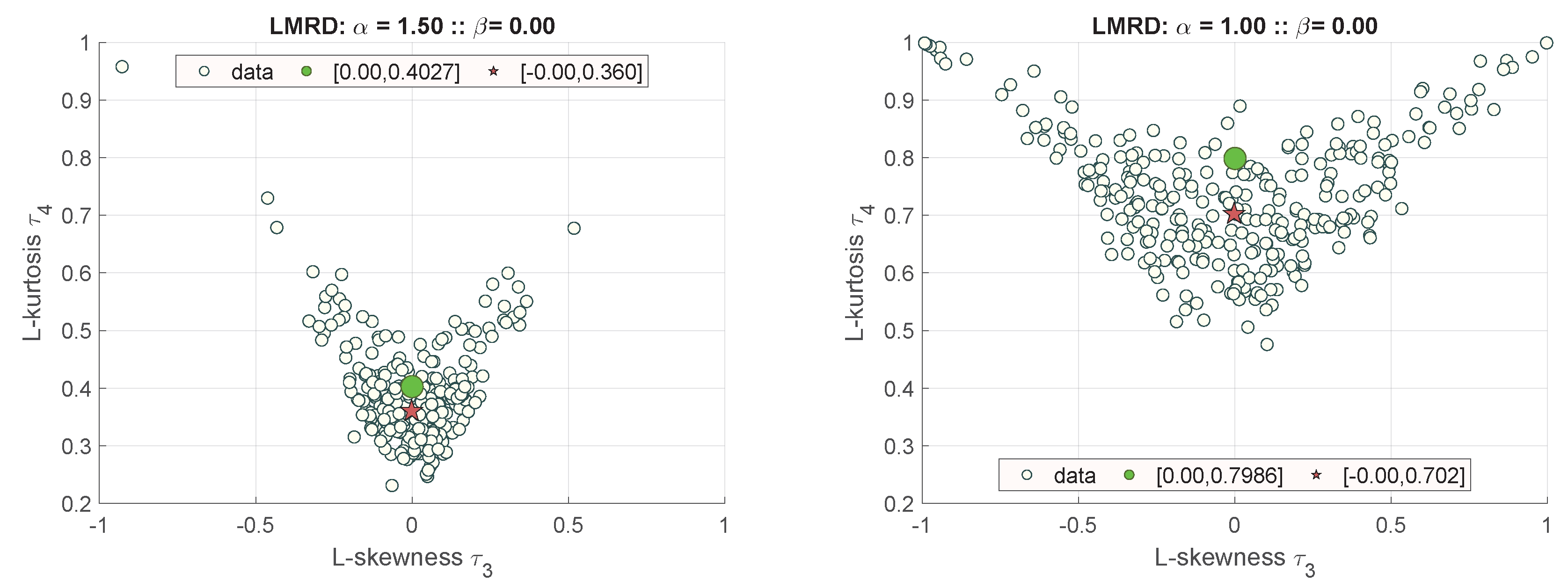 Let us start with a simple case of and PDF in form of . Once , the function simplifies to the normal one . Thus, the third and fourth L-moments equal to and and data in LMRD is reflected by a single point .