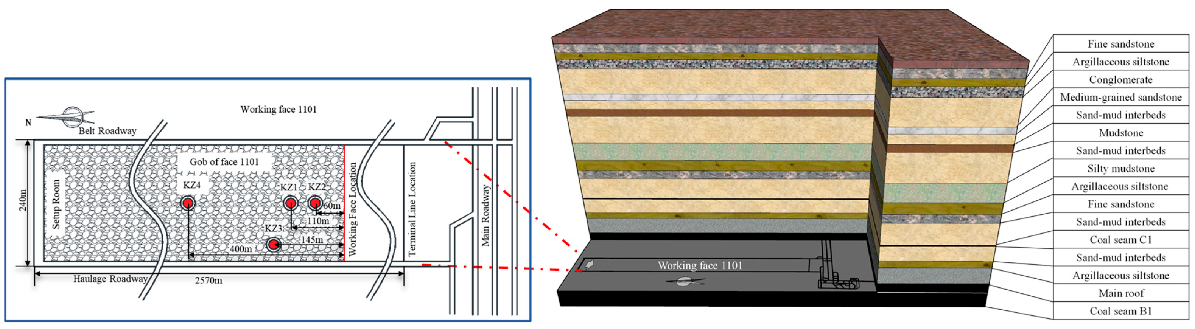 The No. 2 Mine of the Zhundong Coalfield is located 140 km north of Qitai County, Xinjiang Uygur Autonomous Region. The main mining target, the B1 coal seam, is a stable mineable layer with an average thickness of 53.8 m, belonging to the Xishanyao Formation. It is extracted using the layered fully mechanized top-coal caving method. The 1101 first mining face had a dip length of 240 m and a strike length of 2570 m. The average extracted coal thickness was 18 m, consisting of a 4.5 m mining height and a 13.5 m caving height, with a mining-to-caving ratio of 1:3. The average dip angle was 2. The coal seam burial depth ranges from 510 to 544 m. The roof lithology primarily consists of fine-grained sandstone, siltstone, and argillaceous sandstone. The overburden structure comprises multiple thick, weakly cemented interbedded sandy and muddy layers. The overall overburden exhibits weak mechanical properties. Borehole data reveal three thick soft rock layers (TS): TS-1 (50.56 m thick, 35.56 m above coal seam), TS-2 (59.45 m thick, 101.91 m above coal seam), and TS-3 (25.44 m thick, 180.9 m above coal seam). The WF layout and overburden distribution are shown in Figure 1.