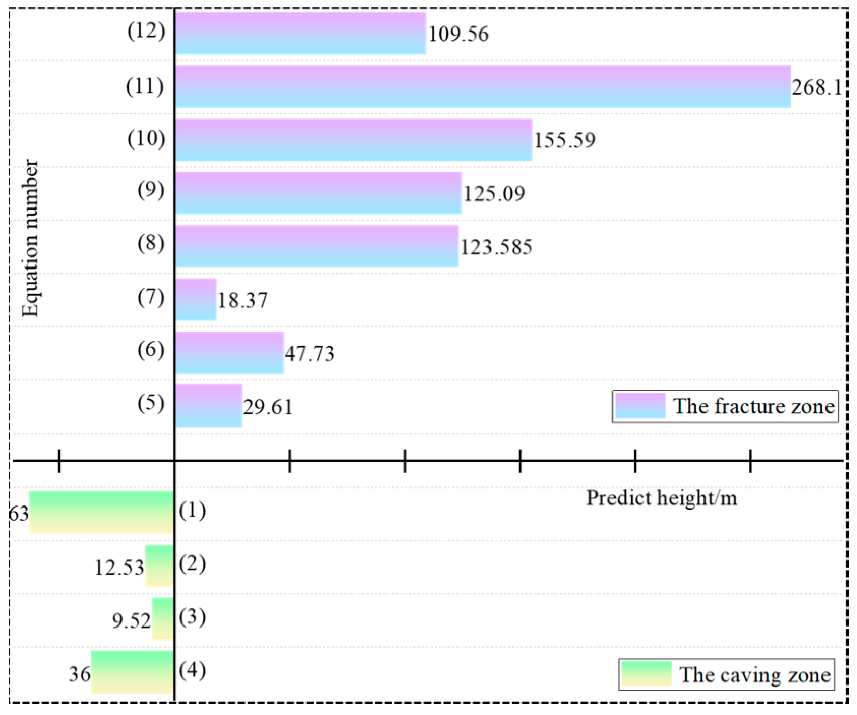The accurate identification of the WCFZ is critical for mine safety and environmental protection. To improve prediction accuracy, researchers have refined these equations through statistical analysis based on region-specific geological conditions, incorporating different influencing factors and discrimination criteria [33]. Based on the background parameters of the 1101 WF, this paper compares modified empirical equations for weak overburden conditions with typical empirical equations, with results summarized in Table 1 and Figure 2. Among them, Equations (1)–(4) address the height prediction of the caving zone [11,12,13,15], while Equations (5)–(12) target the height prediction of the WCFZ [12,13,14,15,16,17,21].