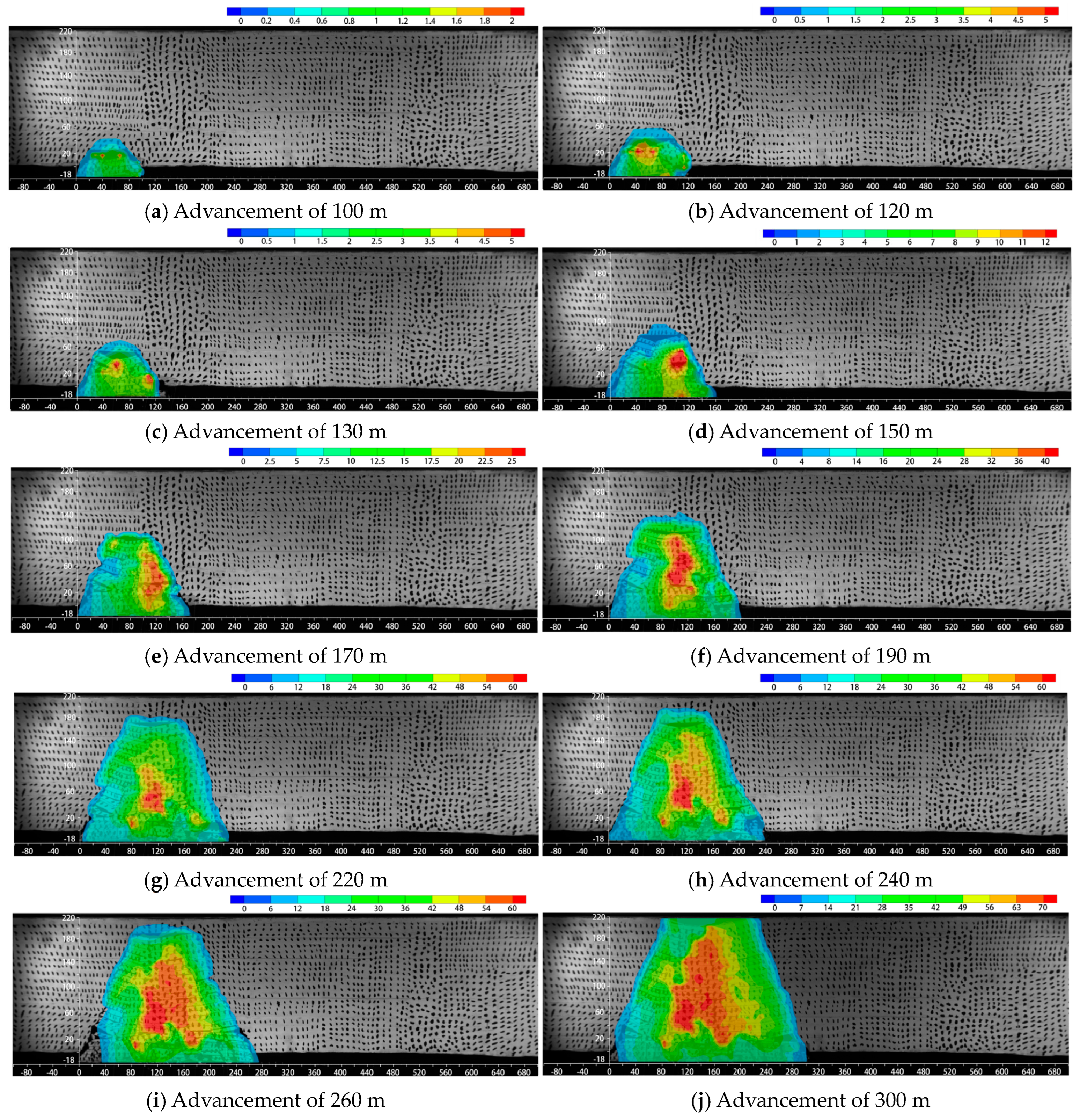 After excavation, the collected images were imported into digital speckle software for calculation to obtain displacement nephograms of the similarity model. For clarity, the original images of the model were superimposed with the displacement nephograms to visualize overburden displacement at different advancement distances, as shown in Figure 4.
