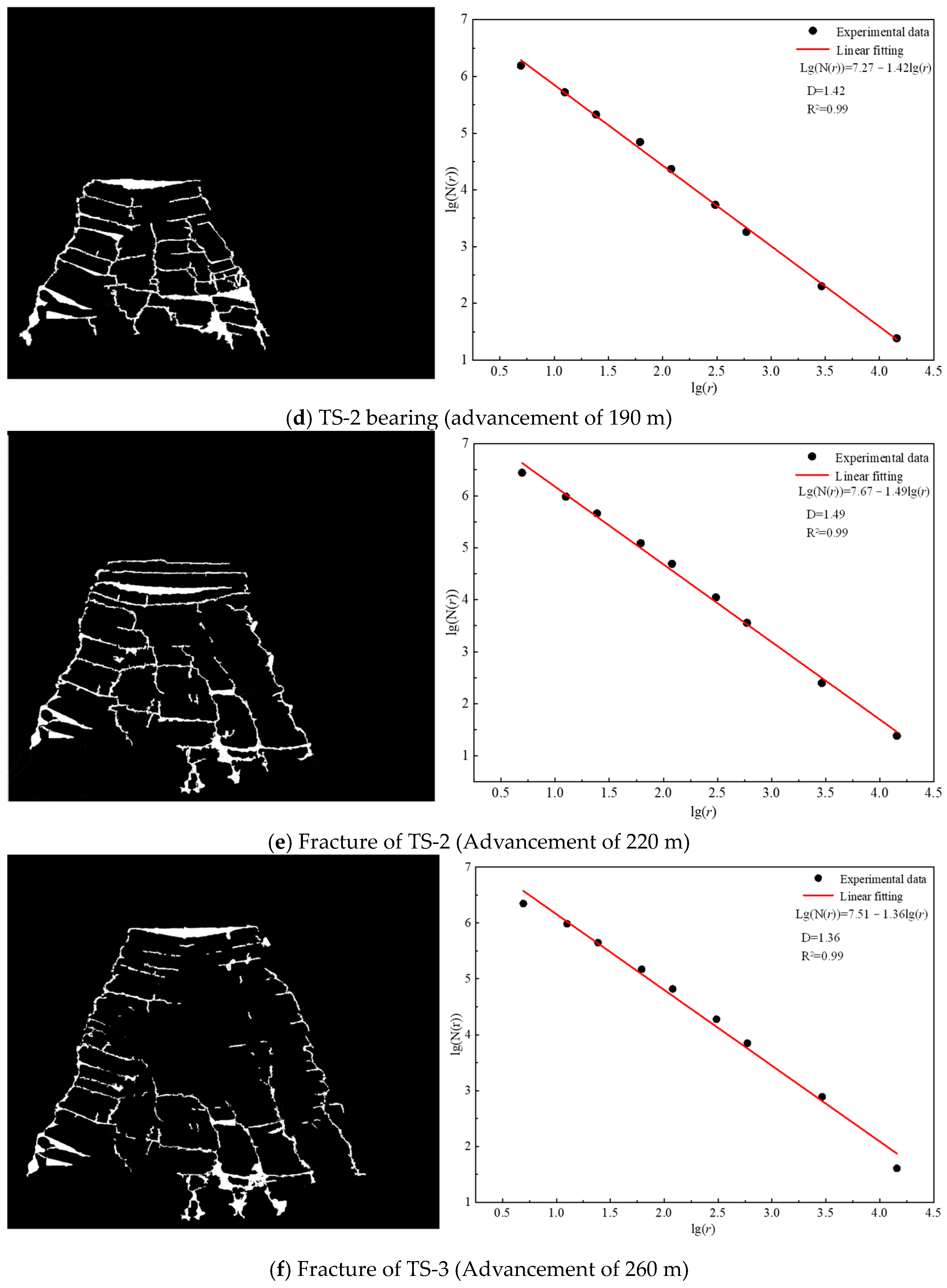 As shown in Figure 5, the correlation coefficients (R2) for D calculations all exceed 0.96, indicating that the evolution of mining-induced fracture networks in overburden exhibits significant fractal characteristics. During the WF advancement, the presence of multiple TS results in distinct BST features within the overburden. In Figure 5b, due to the load-bearing capacity of the TS-1, the D remains at only 1.33 when the fracture zone develops into its region, with a clear BST space observed below TS-1. As shown in Figure 5c, after the fracture of the TS-1, mining-induced fractures develop markedly, increasing the D to 1.44. At this stage, the fractures extend to below the TS-2.