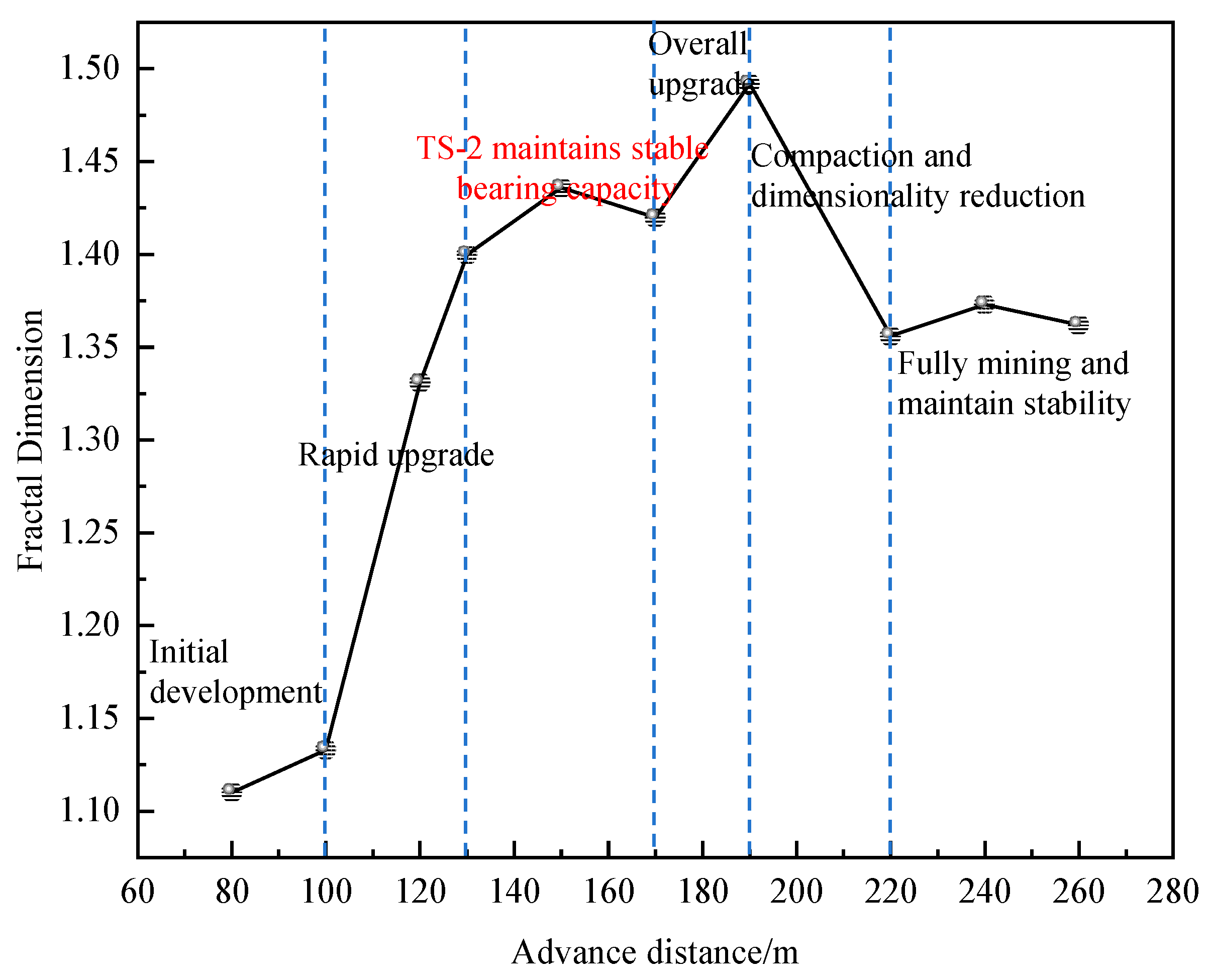 The evolution characteristics of mining-induced fractures in WCO were quantitatively characterized using D. Under the guiding and controlling role of TS, the D of overburden fractures exhibited a “step-like” dynamic evolution pattern. The maximum D reached 1.49 after the fracture of the TS-1. Following the fracture of TS-2, near-field fractures were significantly compacted, resulting in dimension reduction. The D stabilized at 1.36–1.37 when the WF reached full mining-induced stability.