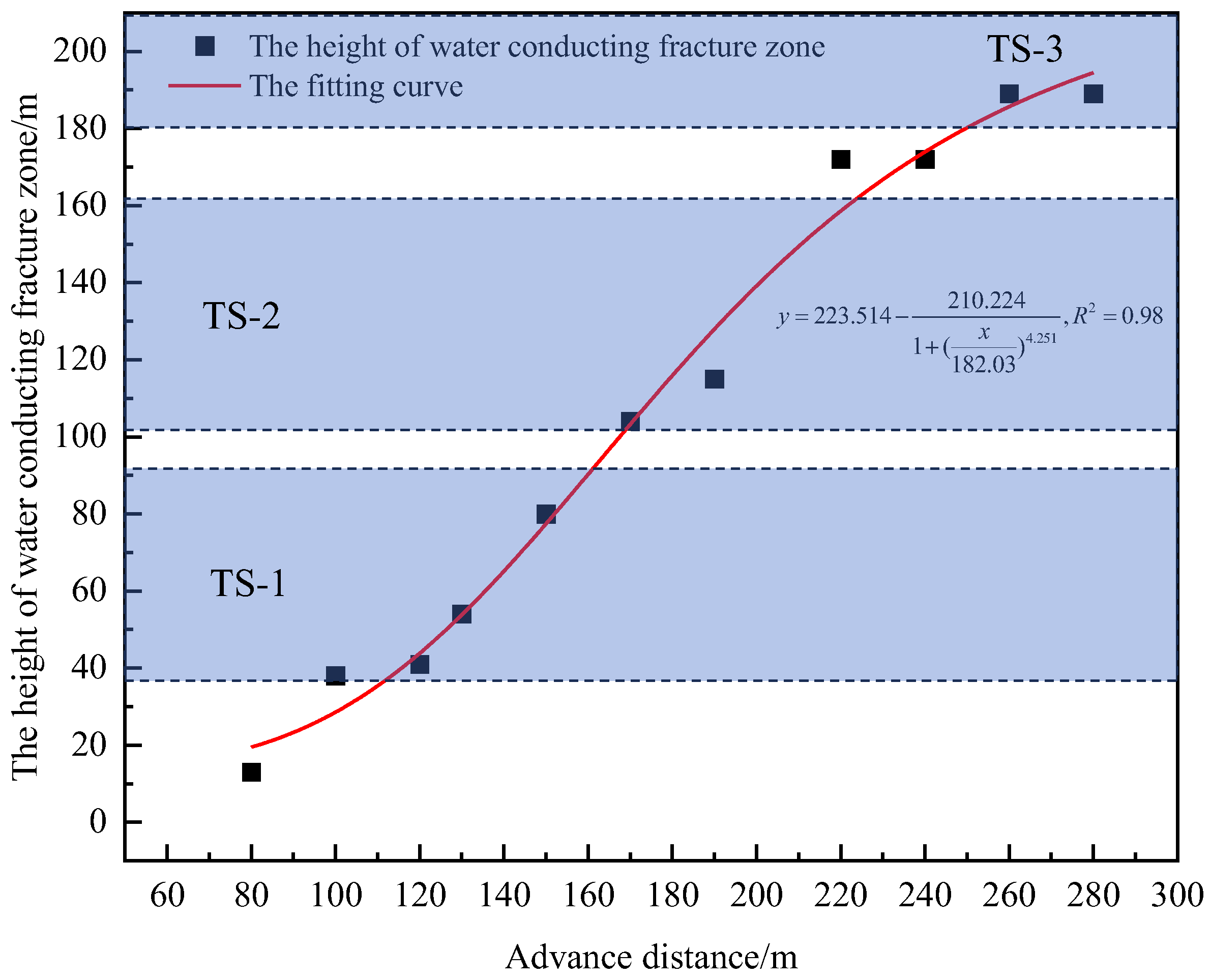 TS guides and controls the evolution of mining-induced fractures in WCO. The height of the WCFZ exhibits a non-linear increasing trend with WF advancement, reaching a maximum height of 189 m and a height-to-mining ratio of 10.5 upon achieving full mining-induced stability. BST spaces primarily develop beneath TS and propagate in a jumping manner following the rupture of these strata. The height of both fractures and BST shows a significant positive correlation with the WF advancement distance.