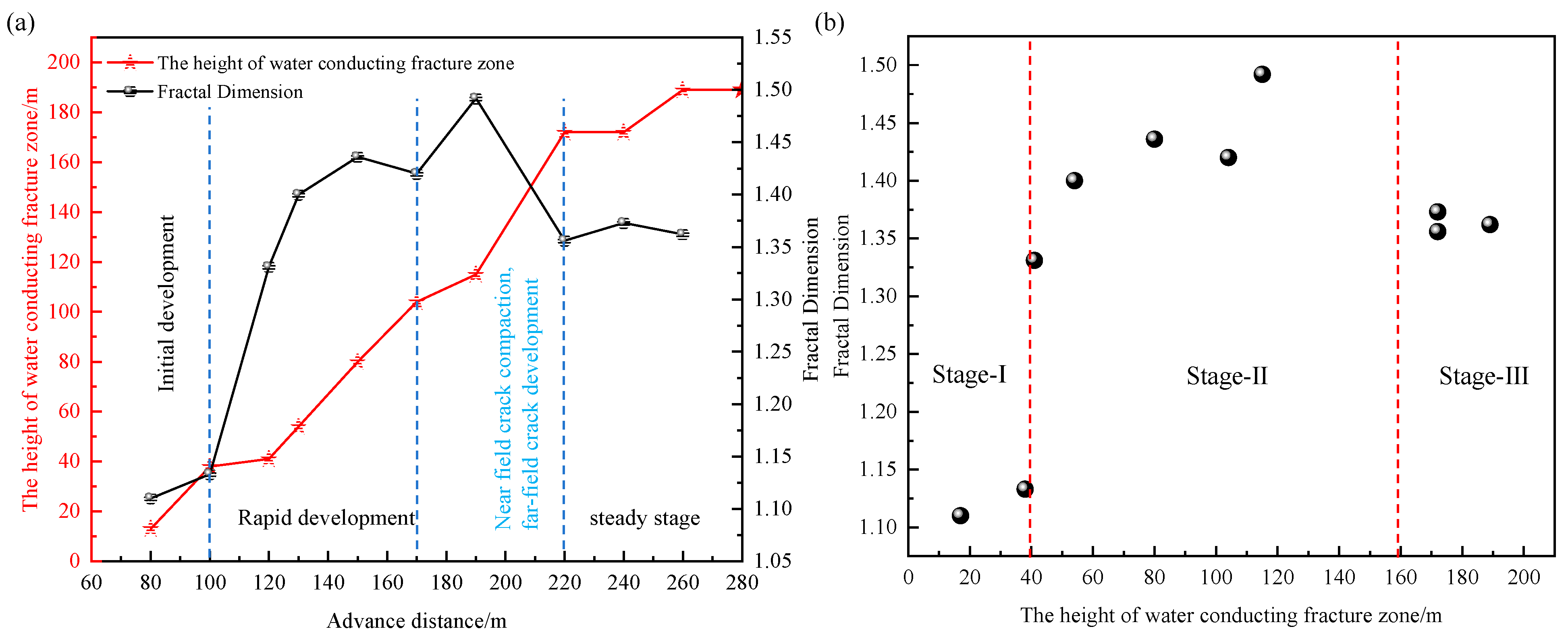 Additionally, after coal seam mining disturbance, the overlying strata fracture and collapse, forming a “three-zone” failure pattern. Within the caved and fractured zones, mining-induced fractures interlace vertically and horizontally, exhibiting active fracture network development. Figure 8 illustrates the correlation between the D of the overburden fracture network and the height of the WCFZ during WF advancement. As shown in Figure 7, overburden fractures began to develop gradually when the WF advanced to 100 m, marking the initial stage of fracture network formation. During the advancement from 100 to 170 m, fractures expanded rapidly in both spatial extent and depth, significantly increasing the complexity of the fracture network. From 170 to 220 m of advancement, the inhibitory effect and creep characteristics of the TS-2 slowed the growth of both D and fracture development. After 220 m of advancement, the complete fracture of TS-2 triggered coordinated failure with TS-1, leading to compaction of near-field collapsed blocks and partial fracture closure. This reduced the complexity of the fracture network and decreased the D. While fractures extended further into the far-field, the confined mining space and controlling influence of TS-3 rapidly stabilized the overburden fractures following the failure of TS-2. Based on the fluctuating evolution trend of the D of overburden fractures, the development of the WCFZ height is divided into three stages (Figure 8b): initial fracture development, vertical expansion, and stabilization. These stages quantitatively explain the developmental patterns and spatial distribution of overburden fractures during WF advancement [41].