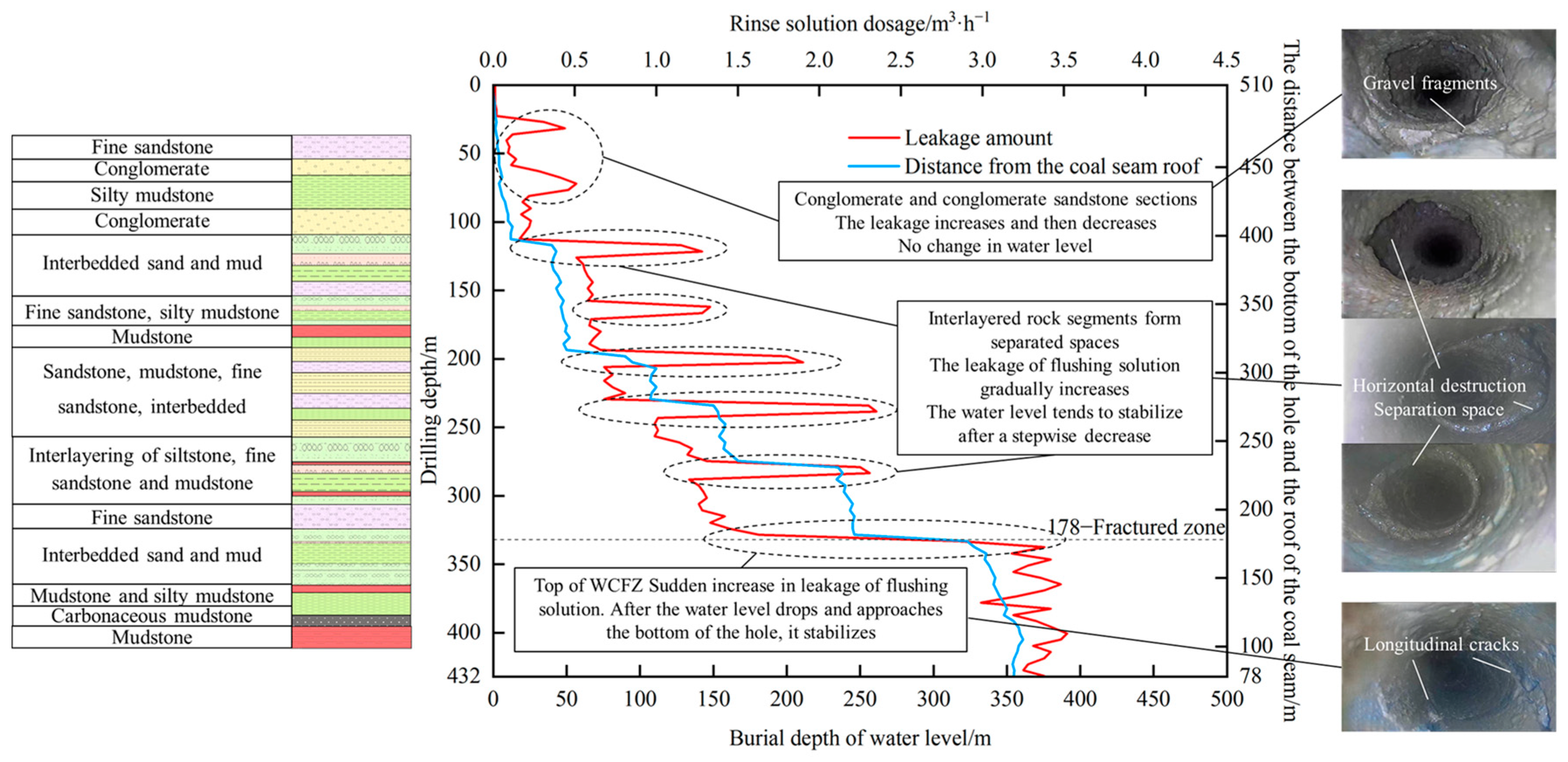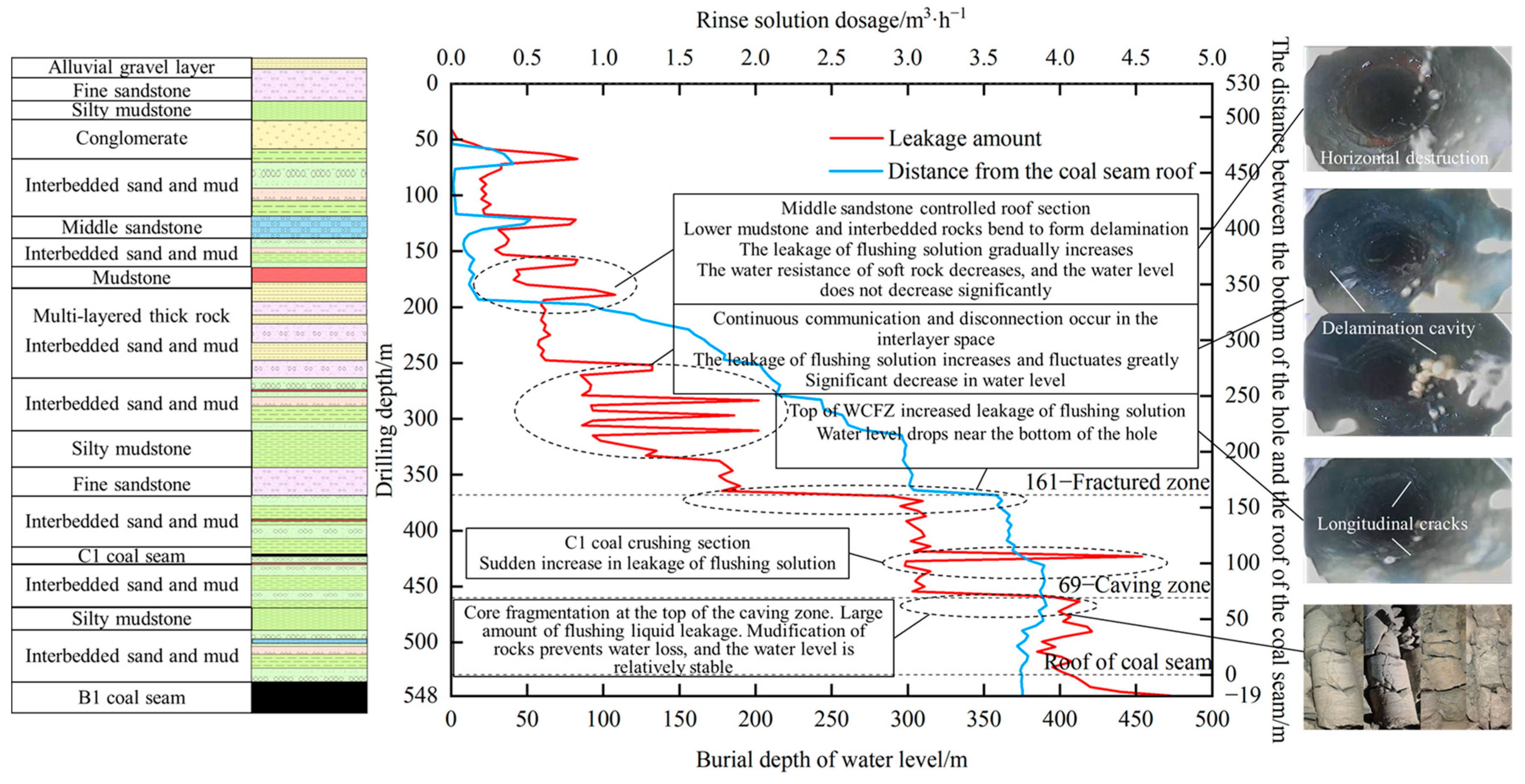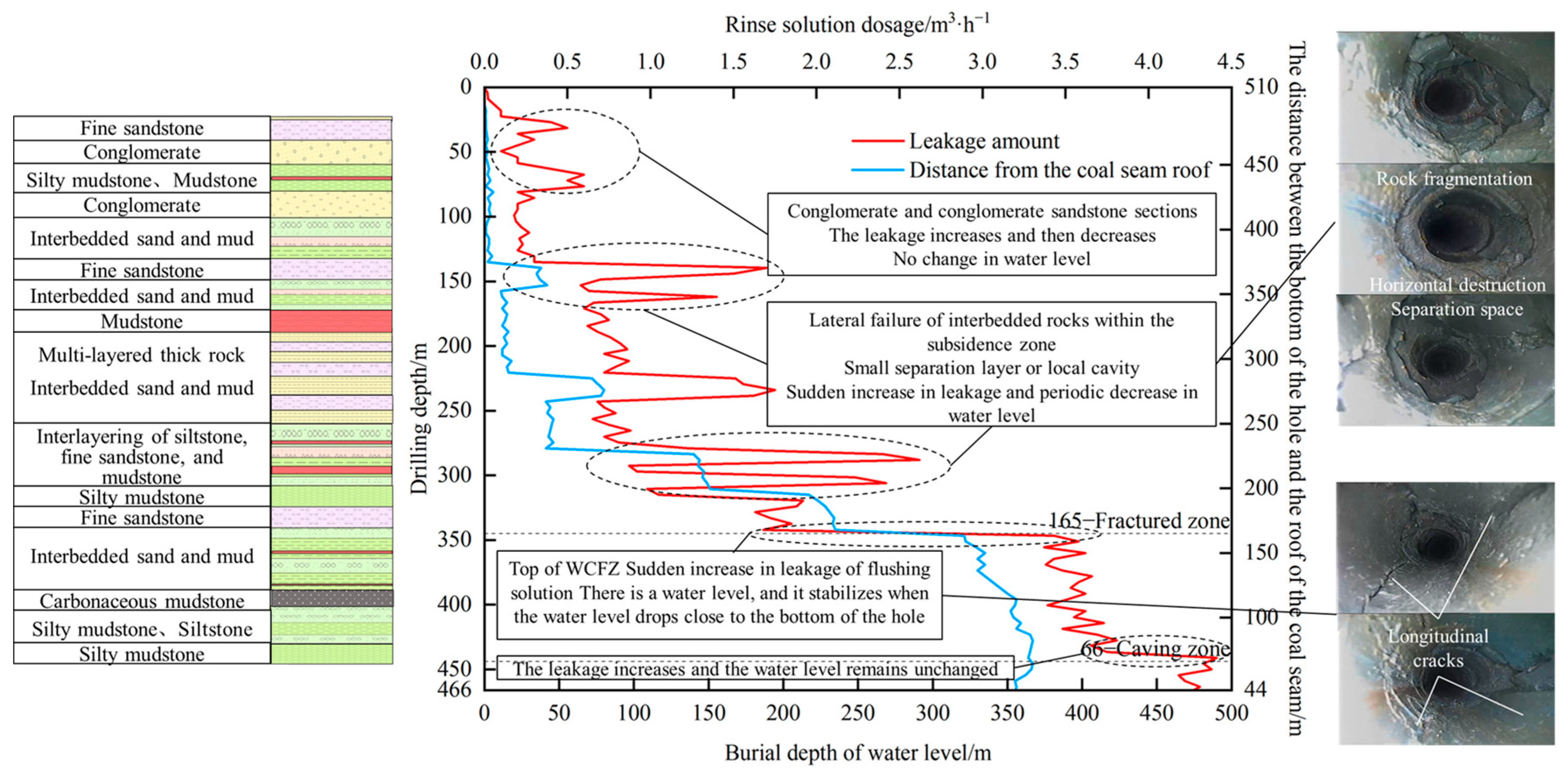 As shown in Figure 11, Borehole ZK-4 was protected by casing within 0–50 m. At 63 m depth, flushing fluid consumption showed a sudden increase followed by a decrease, accompanied by a minor temporary water level decline and subsequent recovery. Borehole televiser observations indicated severe damage and pre-existing fractures in the conglomerate section. Gradual increases in fluid consumption occurred at depths of 121.5 m, 157.5 m, and 184.5 m, with minor water level fluctuations but no significant decline. Based on televiser data and the geological column, this section was identified as coordinated deformation of medium sandstone, sandstone-mudstone interbeds, and mudstone, causing periodic fluid consumption rises while the water level remained stable due to the aquifuge effect of mudstone. At depths of 252 m, 283 m, 297 m, 310.5 m, and 337.5 m within thick sandstone-mudstone interbeds, significant horizontal fractures and BST cavities caused substantial fluctuations in fluid consumption and staged water level drops. At 369 m depth, fluid consumption surged with complete loss of circulation, and the water level dropped to the bottom. Televiser observations revealed vertical fractures, which increased in number and size with depth, confirming the top boundary of the WCFZ at approximately 161 m above the coal seam roof. At 423 m depth, a brief spike in fluid consumption occurred and then stabilized, identified as leakage from the fractured C1 thin coal seam based on the geological column. At 461 m depth, fluid consumption increased again, with loose, fragmented core and severe fractures indicating the top boundary of the caved zone at 69 m above the coal seam roof. As drilling reached the original coal seam roof at 530 m and advanced to the floor at 548 m, leakage gradually increased. The water level fluctuated but remained relatively stable due to the aquifuge effect of mudded, fragmented rock in the caved zone.