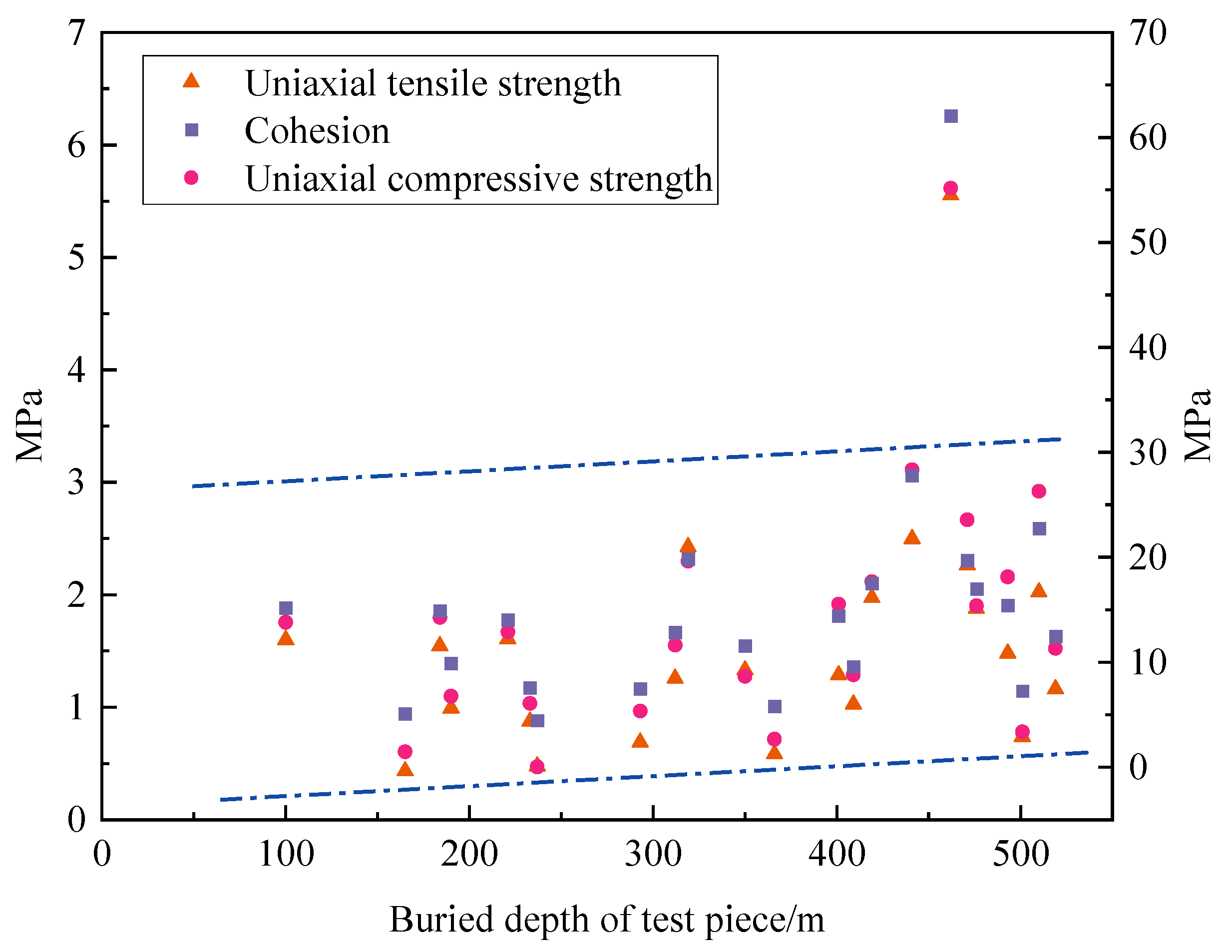 Figure 13. Variations in uniaxial tensile strength, cohesion, and uniaxial compressive strength with specimen burial depth.